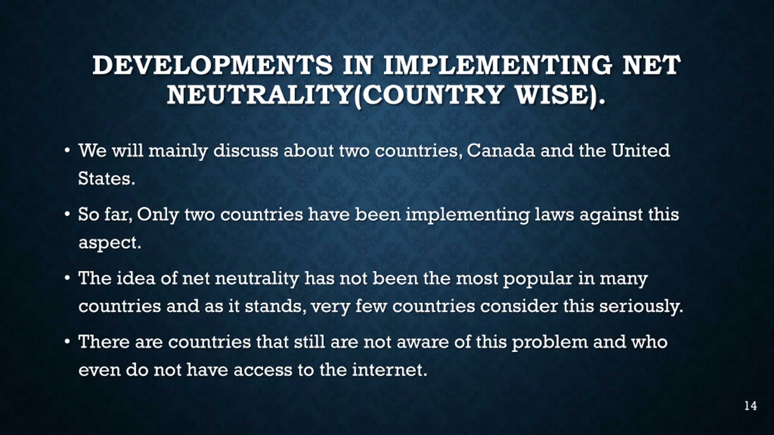 DEVELOPMENTS IN IMPLEMENTING NET NEUTRALITY(COUNTRY WISE). We will mainly discuss about two countries, Canada and the United States. So far, Only two countries have been implementing laws against this aspect. The idea of net neutrality has not been the most popular in many countries and as it stands, very few countries consider this seriously. There are countries that still are not aware of this problem and who even do not have access to the internet. 14