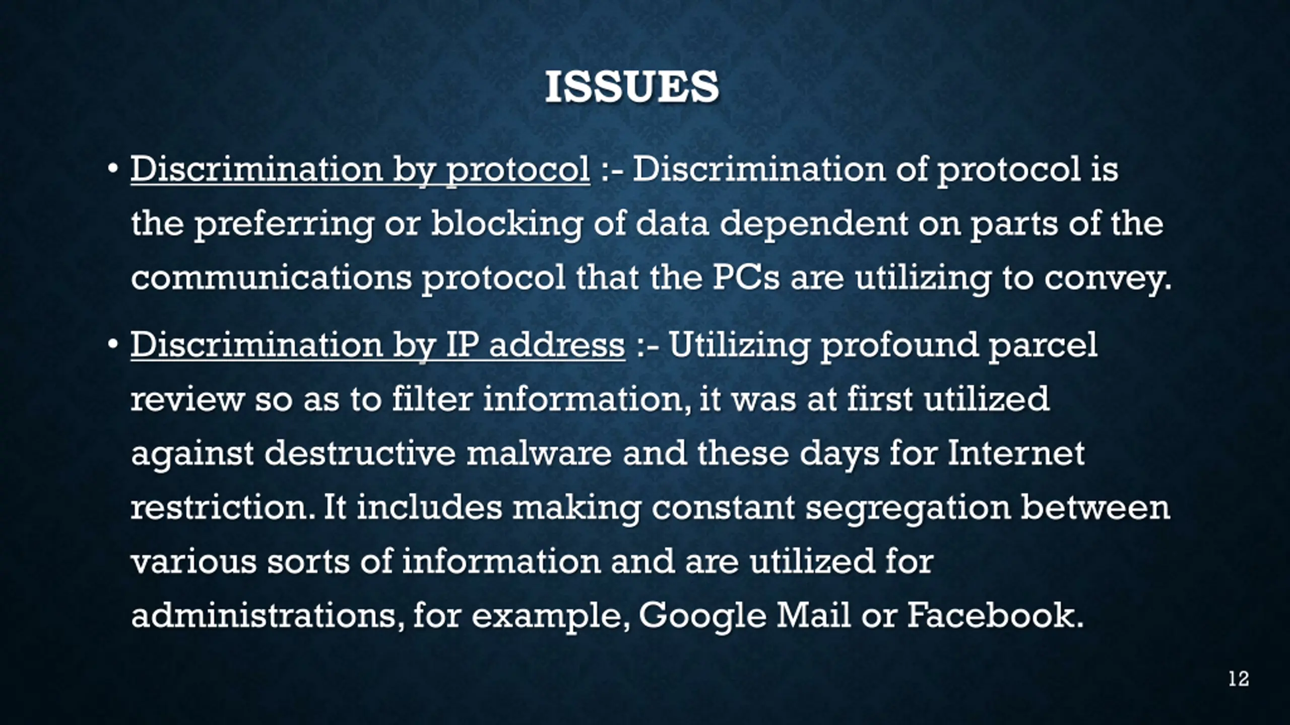 ISSUES Discrimination by protocol :- Discrimination of protocol is the preferring or blocking of data dependent on parts of the communications protocol that the PCs are utilizing to convey. Discrimination by IP address :- Utilizing profound parcel review so as to filter information, it was at first utilized against destructive malware and these days for Internet restriction. It includes making constant segregation between various sorts of information and are utilized for administrations, for example, Google Mail or Facebook. 12