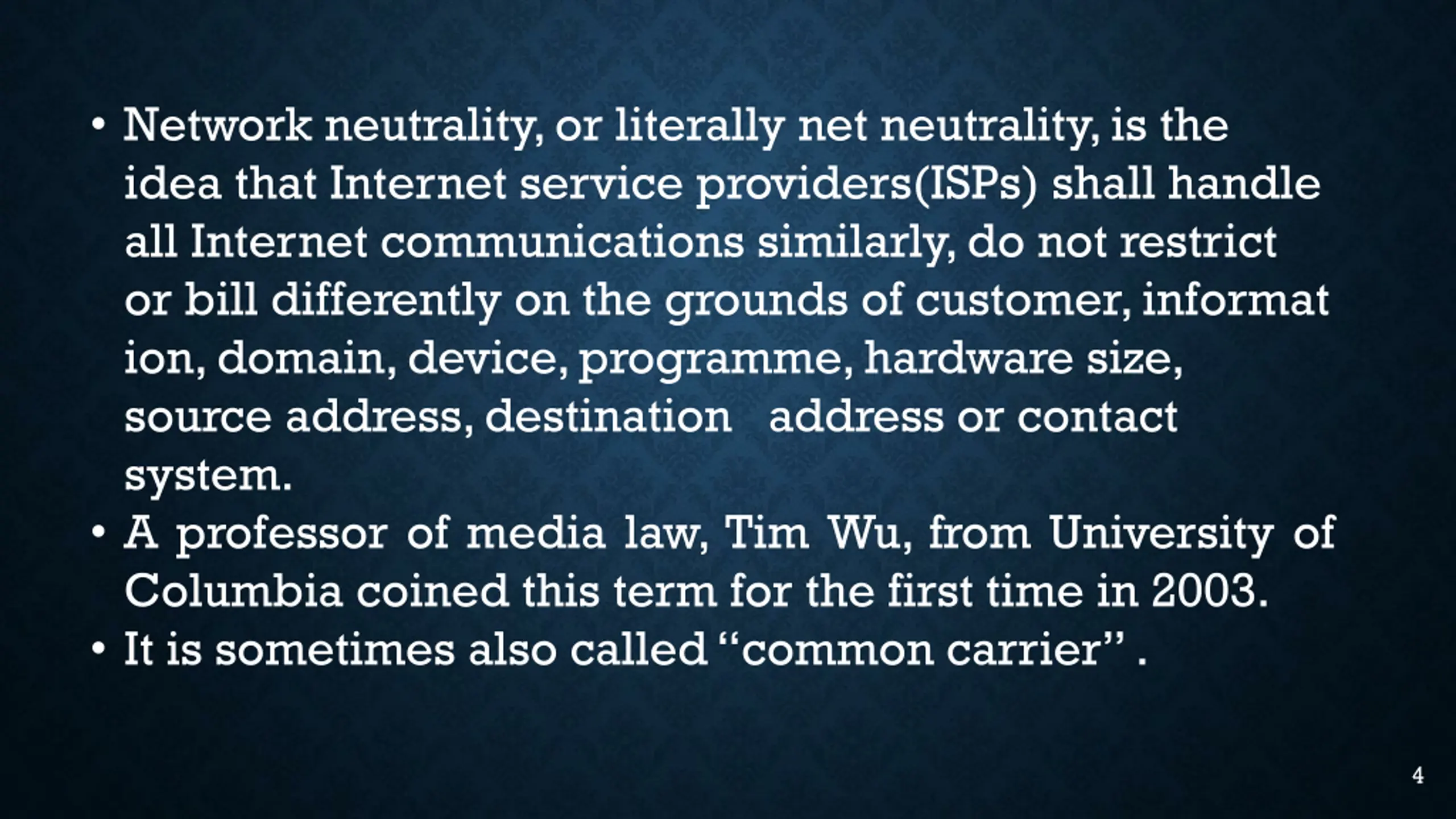Network neutrality,or literally net neutrality,is the idea that Internet service providers(ISPs) shall handle all Internet communications similarly,do not restrict or bill differently on the grounds of customer,informat ion,domain,device,programme,hardware size, source address,destination address or contact system. A professor of media law, Tim Wu, from University of Columbia coined this term for the first time in 2003. It is sometimes also called commoncarrier . 4