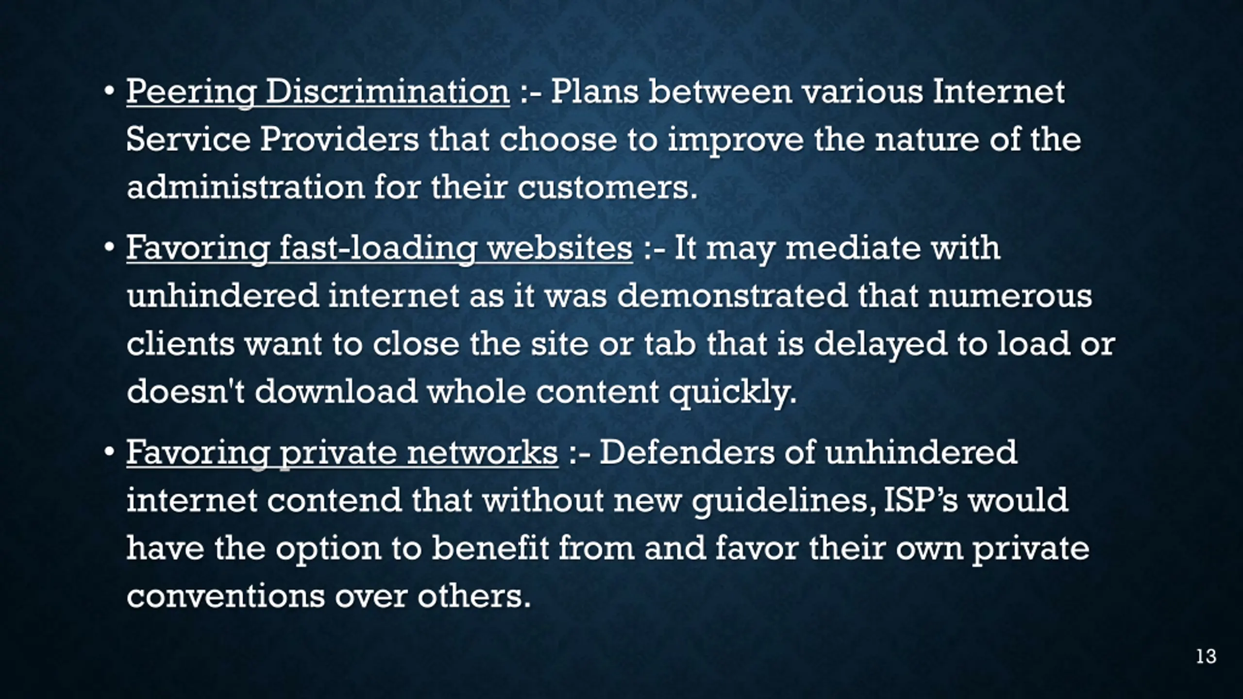 Peering Discrimination :- Plans between various Internet Service Providers that choose to improve the nature of the administration for their customers. Favoring fast-loading websites :- It may mediate with unhindered internet as it was demonstrated that numerous clients want to close the site or tab that is delayed to load or doesn't download whole content quickly. Favoring private networks :- Defenders of unhindered internet contend that without new guidelines, ISP s would have the option to benefit from and favor their own private conventions over others. 13