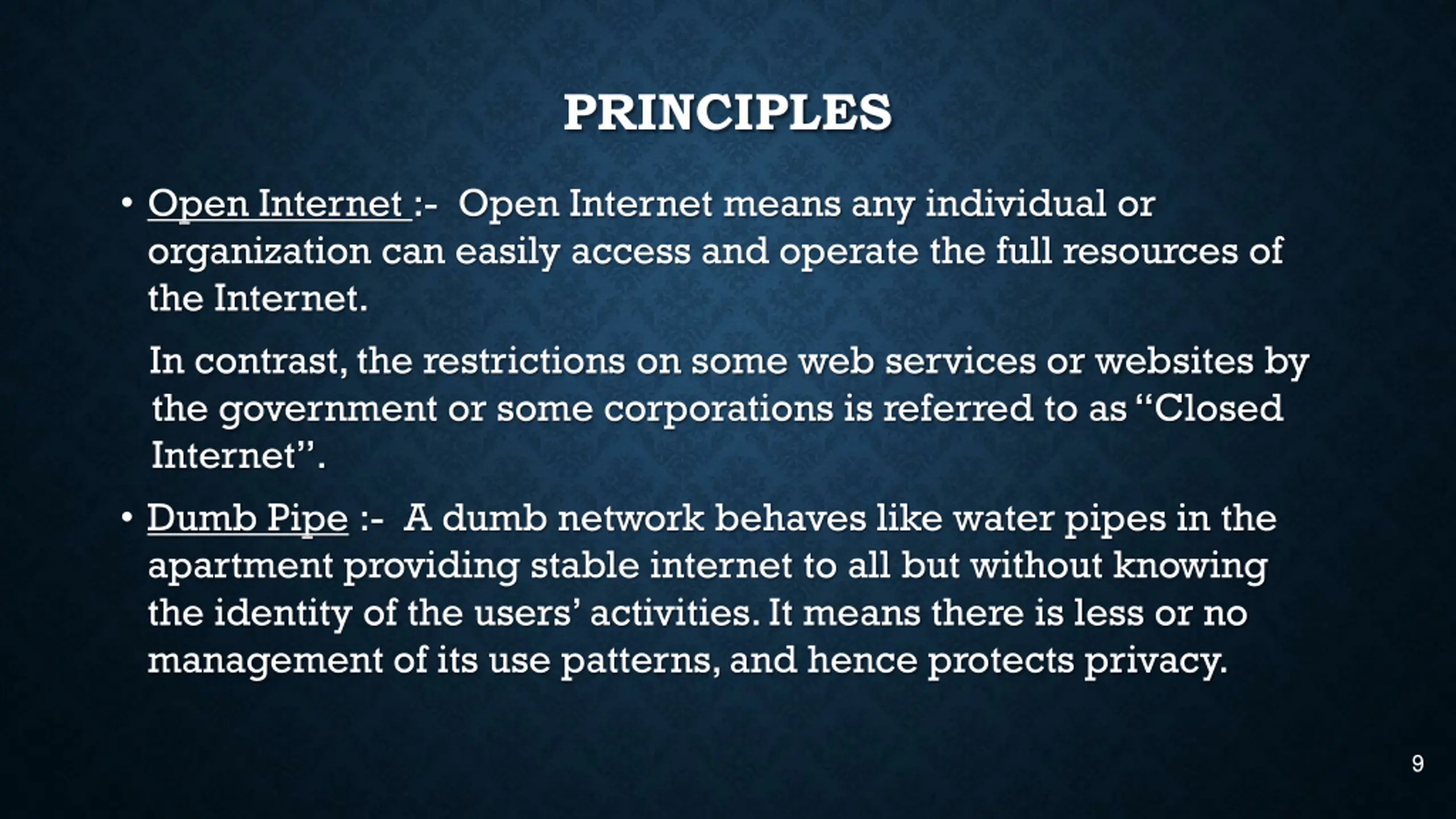 PRINCIPLES Open Internet :- Open Internet means any individual or organization can easily access and operate the full resources of the Internet. In contrast, the restrictions on some web services or websites by the government or some corporations is referred to as Closed Internet . Dumb Pipe :- A dumb network behaves like water pipes in the apartment providing stable internet to all but without knowing the identity of the users activities. It means there is less or no management of its use patterns, and hence protects privacy. 9