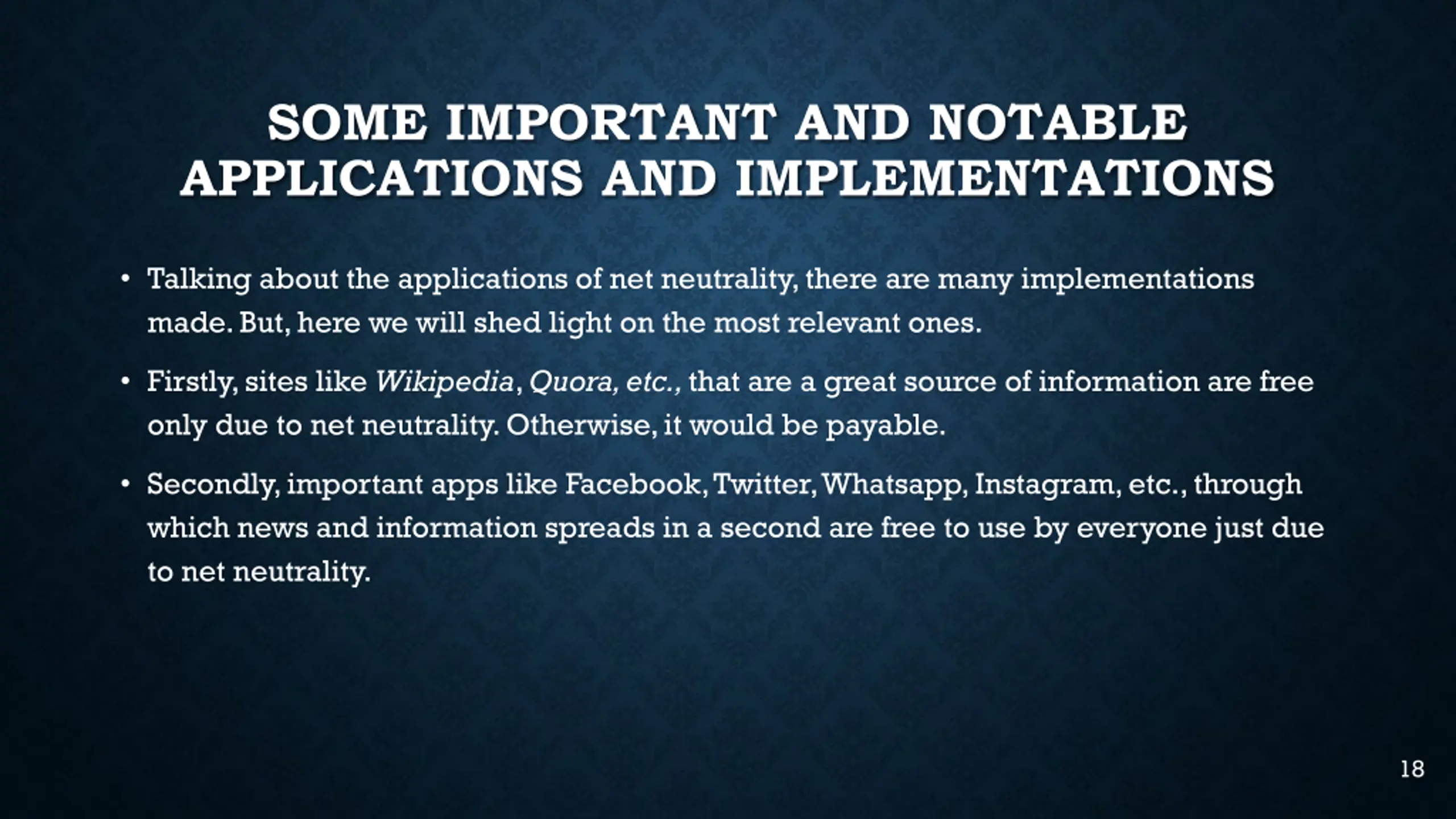 SOME IMPORTANT AND NOTABLE APPLICATIONS AND IMPLEMENTATIONS Talking about the applications of net neutrality, there are many implementations made. But, here we will shed light on the most relevant ones. Firstly, sites like Wikipedia, Quora, etc., that are a great source of information are free only due to net neutrality. Otherwise, it would be payable. Secondly, important apps like Facebook, Twitter, Whatsapp, Instagram, etc., through which news and information spreads in a second are free to use by everyone just due to net neutrality. 18