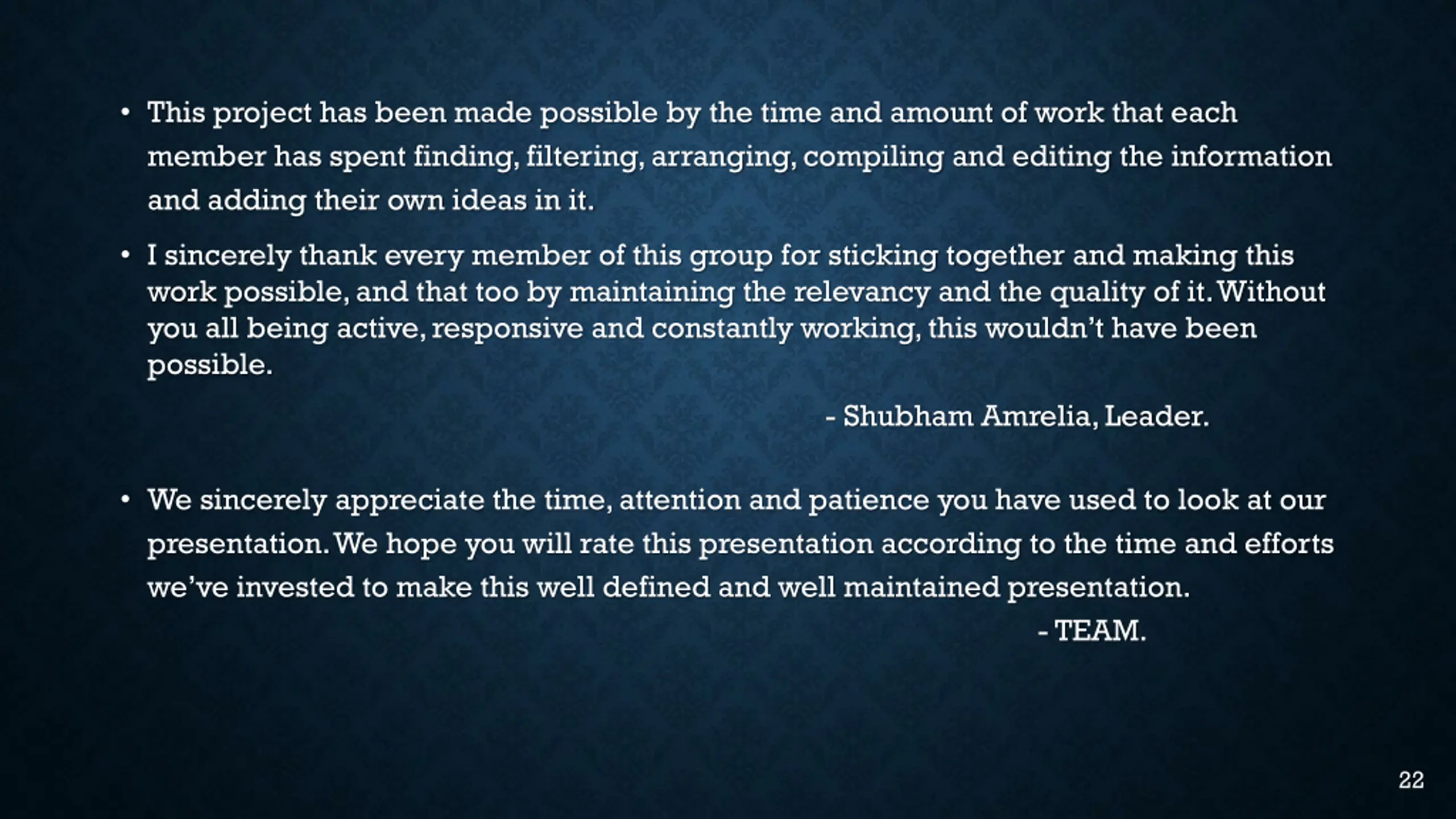 This project has been made possible by the time and amount of work that each member has spent finding, filtering, arranging, compiling and editing the information and adding their own ideas in it. I sincerely thank every member of this group for sticking together and making this work possible, and that too by maintaining the relevancy and the quality of it. Without you all being active, responsive and constantly working, this wouldn t have been possible. - Shubham Amrelia, Leader. We sincerely appreciate the time, attention and patience you have used to look at our presentation. We hope you will rate this presentation according to the time and efforts we ve invested to make this well defined and well maintained presentation. - TEAM. 22