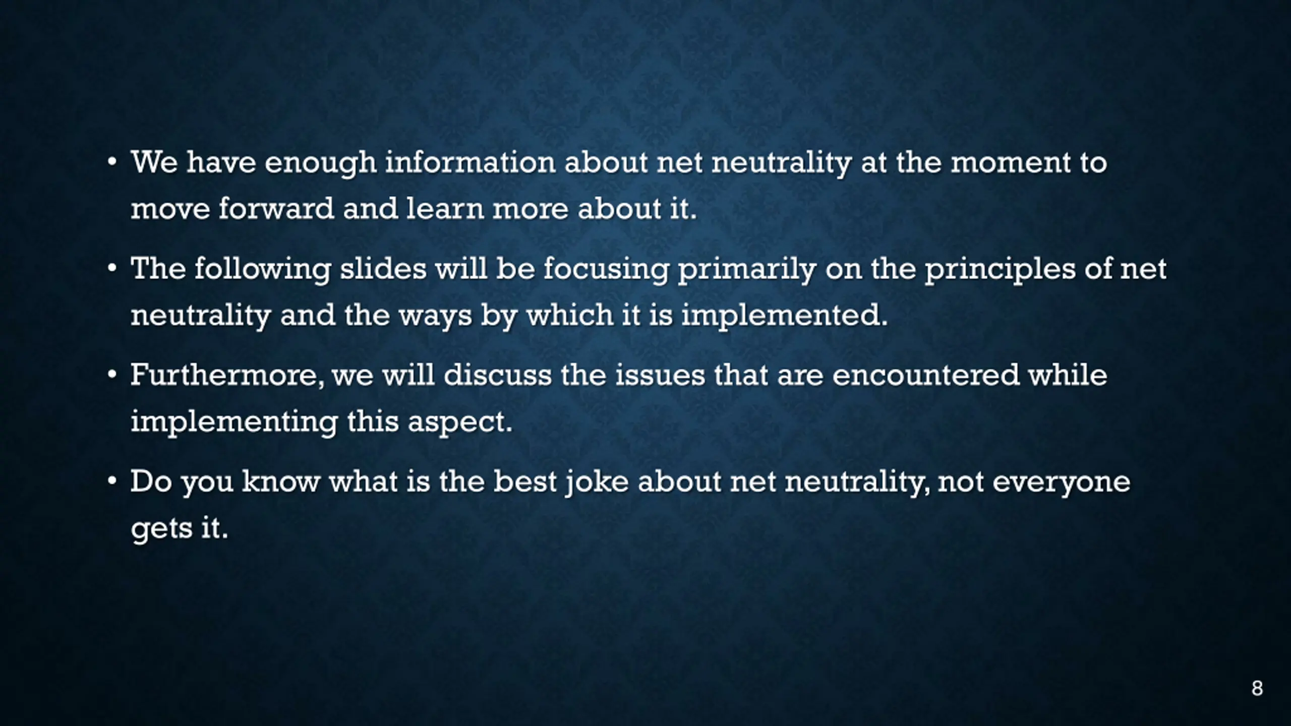 We have enough information about net neutrality at the moment to move forward and learn more about it. The following slides will be focusing primarily on the principles of net neutrality and the ways by which it is implemented. Furthermore, we will discuss the issues that are encountered while implementing this aspect. Do you know what is the best joke about net neutrality, not everyone gets it. 8
