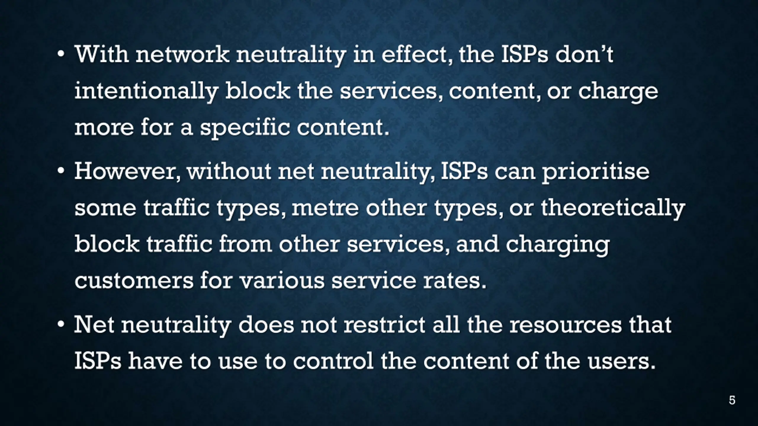 With network neutrality in effect, the ISPs dont intentionally block the services, content, or charge more for a specific content. However, without net neutrality, ISPs can prioritise some traffic types, metre other types, or theoretically block traffic from other services, and charging customers for various service rates. Net neutrality does not restrict all the resources that ISPs have to use to control the content of the users. 5