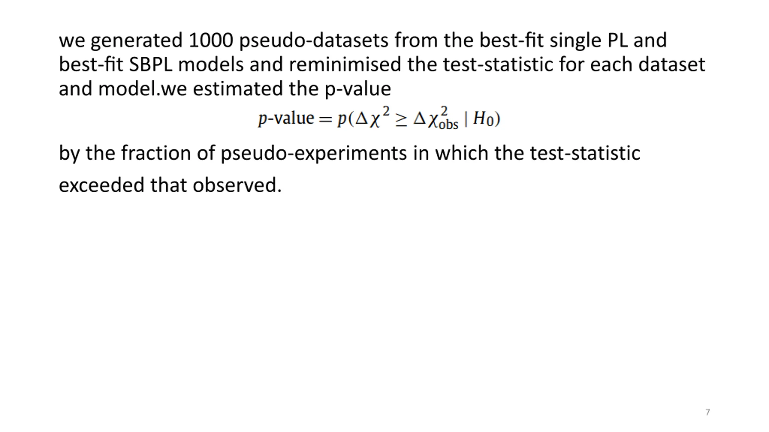 we generated 1000 pseudo-datasets from the best-fit single PL and best-fit SBPL models and reminimised the test-statistic for each dataset and model.we estimated the p-value by the fraction of pseudo-experiments in which the test-statistic exceeded that observed. 7