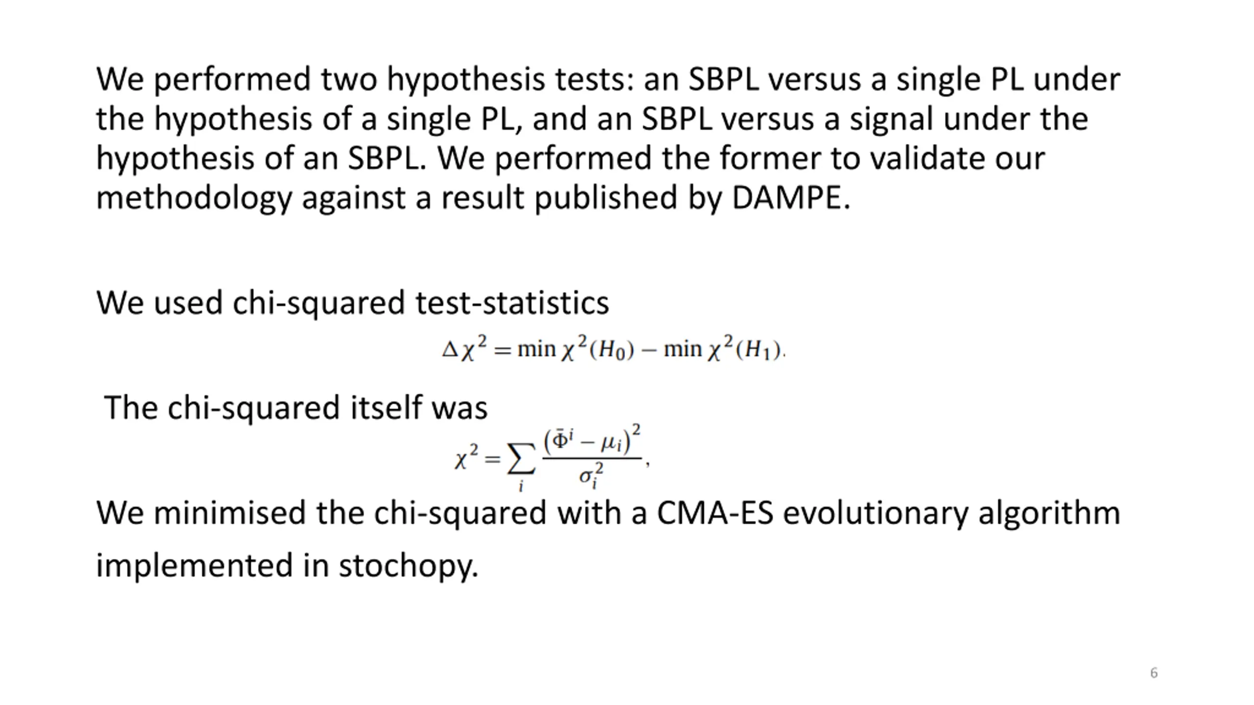 We performed two hypothesis tests: an SBPL versus a single PL under the hypothesis of a single PL, and an SBPL versus a signal under the hypothesis of an SBPL. We performed the former to validate our methodology against a result published by DAMPE. We used chi-squared test-statistics The chi-squared itself was We minimised the chi-squared with a CMA-ES evolutionary algorithm implemented in stochopy. 6