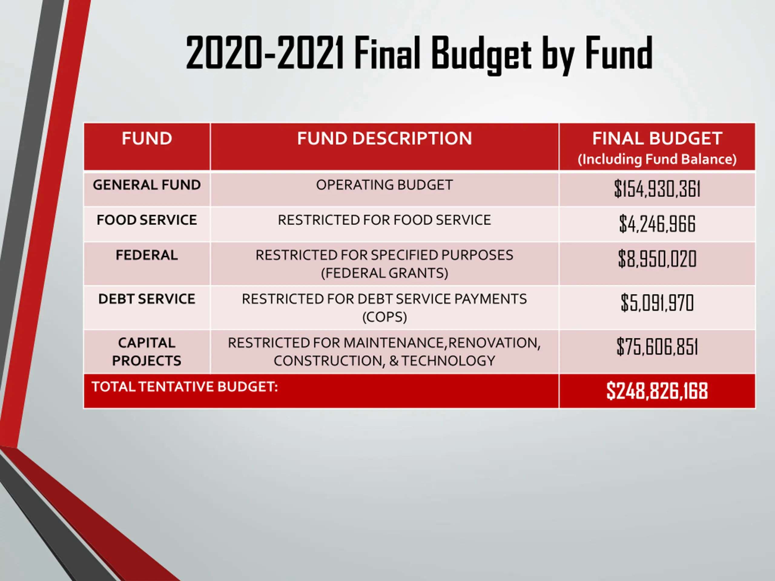2020-2021 Final Budget by Fund FUND FUND DESCRIPTION FINAL BUDGET (Including Fund Balance) $154,930,361 $4,246,966 $8,950,020 GENERALFUND OPERATINGBUDGET FOOD SERVICE RESTRICTED FOR FOOD SERVICE FEDERAL RESTRICTED FOR SPECIFIED PURPOSES (FEDERAL GRANTS) $5,091,970 DEBT SERVICE RESTRICTEDFOR DEBT SERVICE PAYMENTS (COPS) $75,606,851 CAPITAL PROJECTS RESTRICTED FOR MAINTENANCE,RENOVATION, CONSTRUCTION, & TECHNOLOGY $248,826,168 TOTALTENTATIVE BUDGET: