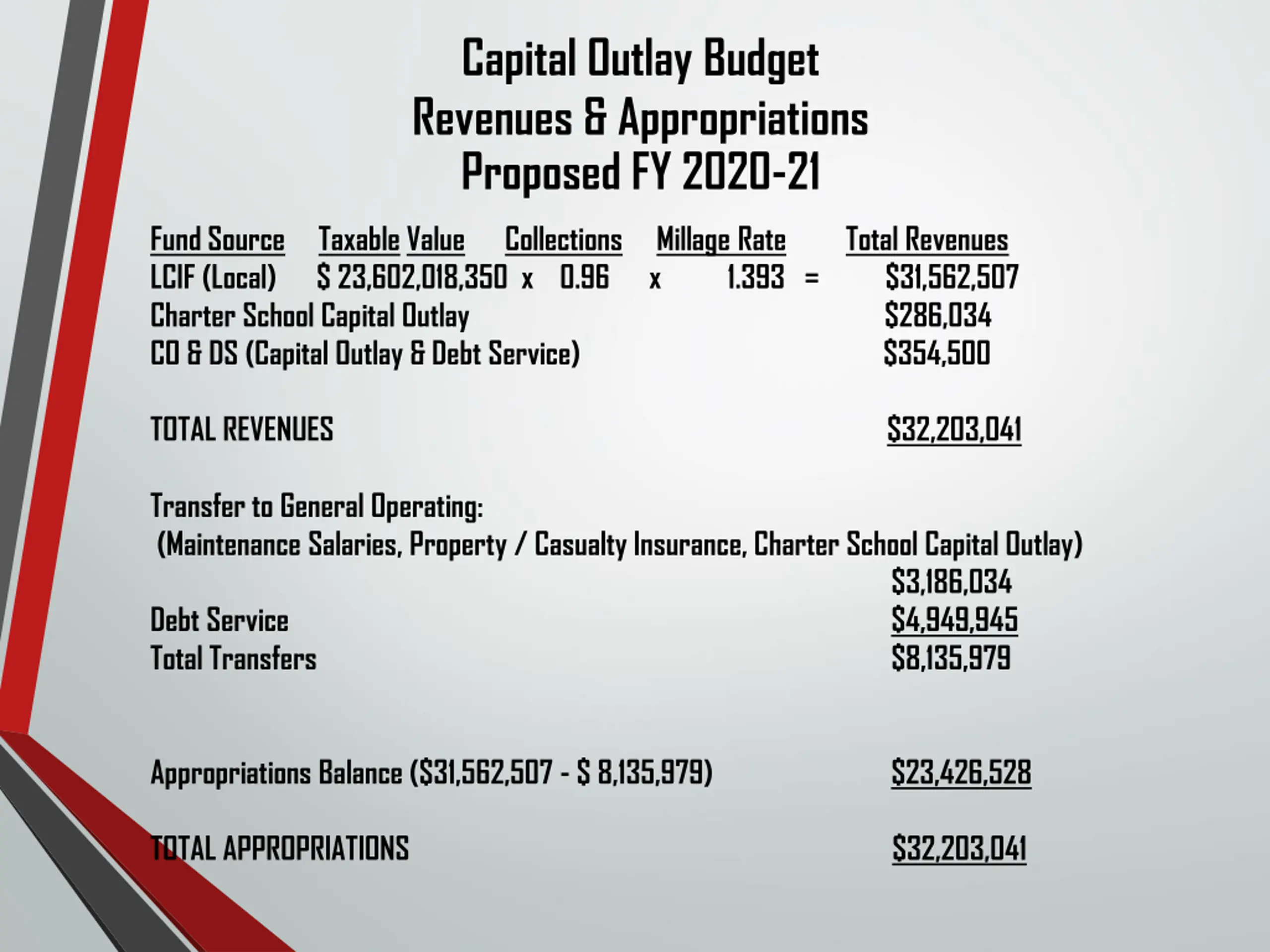 Capital Outlay Budget Revenues & Appropriations Proposed FY 2020-21 Fund Source Taxable Value Collections Millage Rate Total Revenues LCIF (Local) $ 23,602,018,350 x 0.96 x 1.393 = $31,562,507 Charter School Capital Outlay CO & DS (Capital Outlay & Debt Service) $354,500 $286,034 TOTAL REVENUES $32,203,041 Transfer to General Operating: (Maintenance Salaries, Property / Casualty Insurance, Charter School Capital Outlay) Debt Service Total Transfers $3,186,034 $4,949,945 $8,135,979 Appropriations Balance ($31,562,507 - $ 8,135,979) $23,426,528 TOTAL APPROPRIATIONS $32,203,041