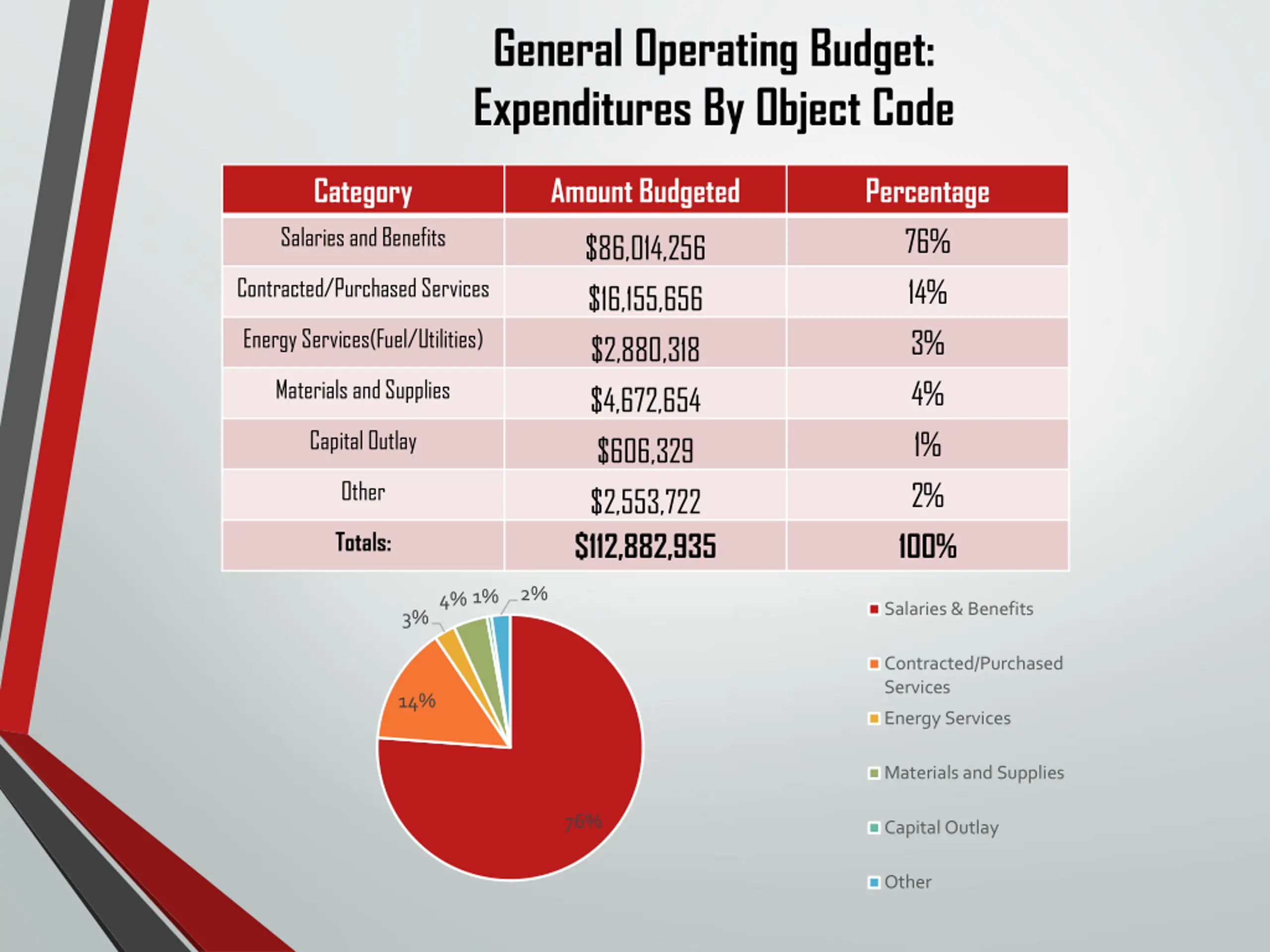 General Operating Budget: Expenditures By Object Code Category Amount Budgeted Percentage 76% 14% 3% 4% 1% 2% 100% Salaries and Benefits $86,014,256 $16,155,656 $2,880,318 $4,672,654 $606,329 $2,553,722 $112,882,935 Contracted/Purchased Services Energy Services(Fuel/Utilities) Materials and Supplies Capital Outlay Other Totals: 2% 4%1% Salaries & Benefits 3% Contracted/Purchased Services 14% Energy Services Materials and Supplies 76% Capital Outlay Other