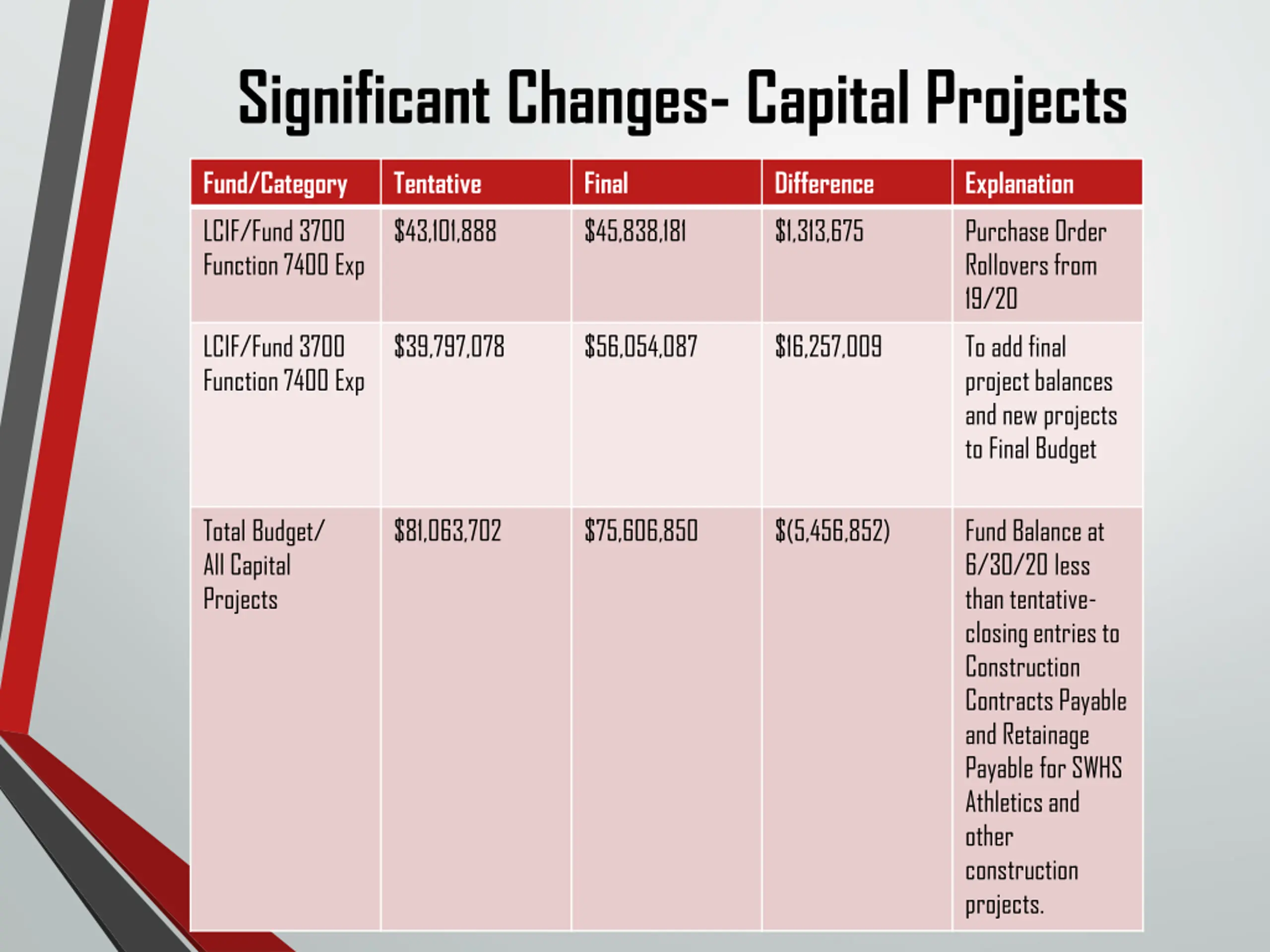 Significant Changes- Capital Projects Fund/Category Tentative Final Difference Explanation Fund LCIF/Fund3700 Function7400 Exp Tentative $43,101,888 Final Difference $45,838,181 $1,313,675 PurchaseOrder Rollovers from 19/20 LCIF/Fund3700 Function 7400 Exp $39,797,078 $56,054,087 $16,257,009 To add final projectbalances and new projects to Final Budget Total Budget/ AllCapital Projects $81,063,702 $75,606,850 $(5,456,852) FundBalance at 6/30/20 less than tentative- closing entries to Construction Contracts Payable and Retainage Payable for SWHS Athletics and other construction projects.