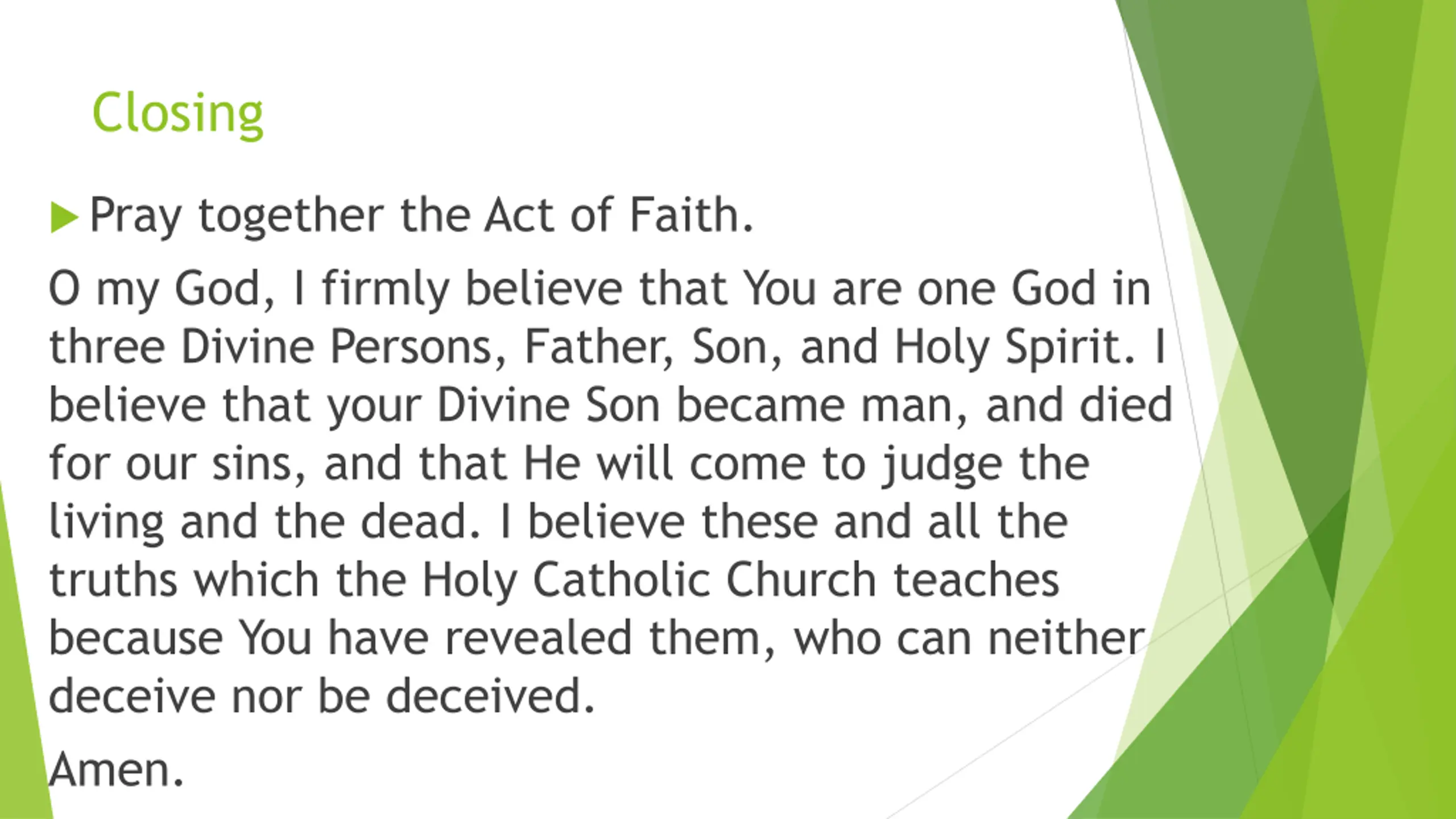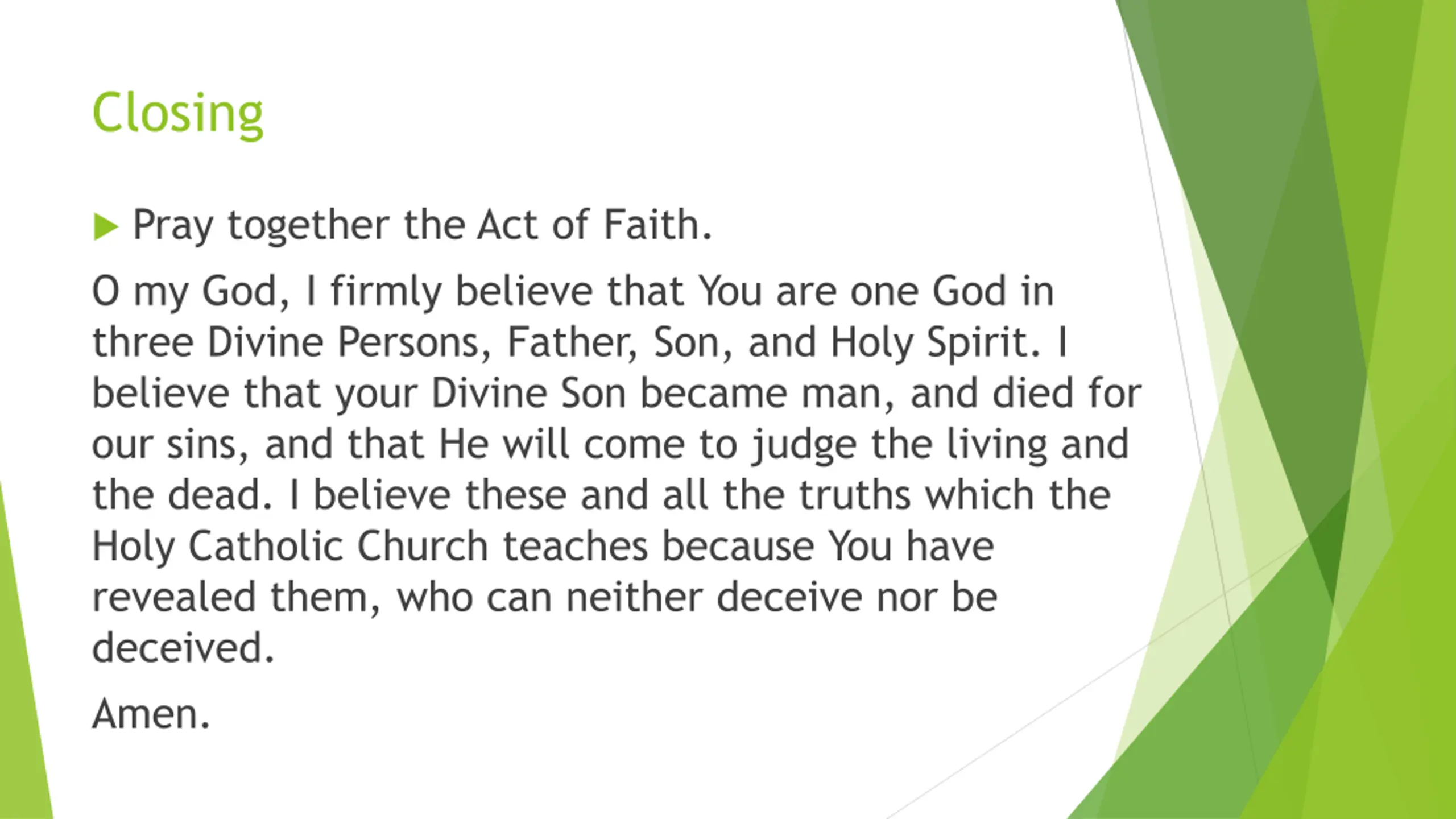 Closing Pray together the Act of Faith. O my God, I firmly believe that You are one God in three Divine Persons, Father, Son, and Holy Spirit. I believe that your Divine Son became man, and died for our sins, and that He will come to judge the living and the dead. I believe these and all the truths which the Holy Catholic Church teaches because You have revealed them, who can neither deceive nor be deceived. Amen.
