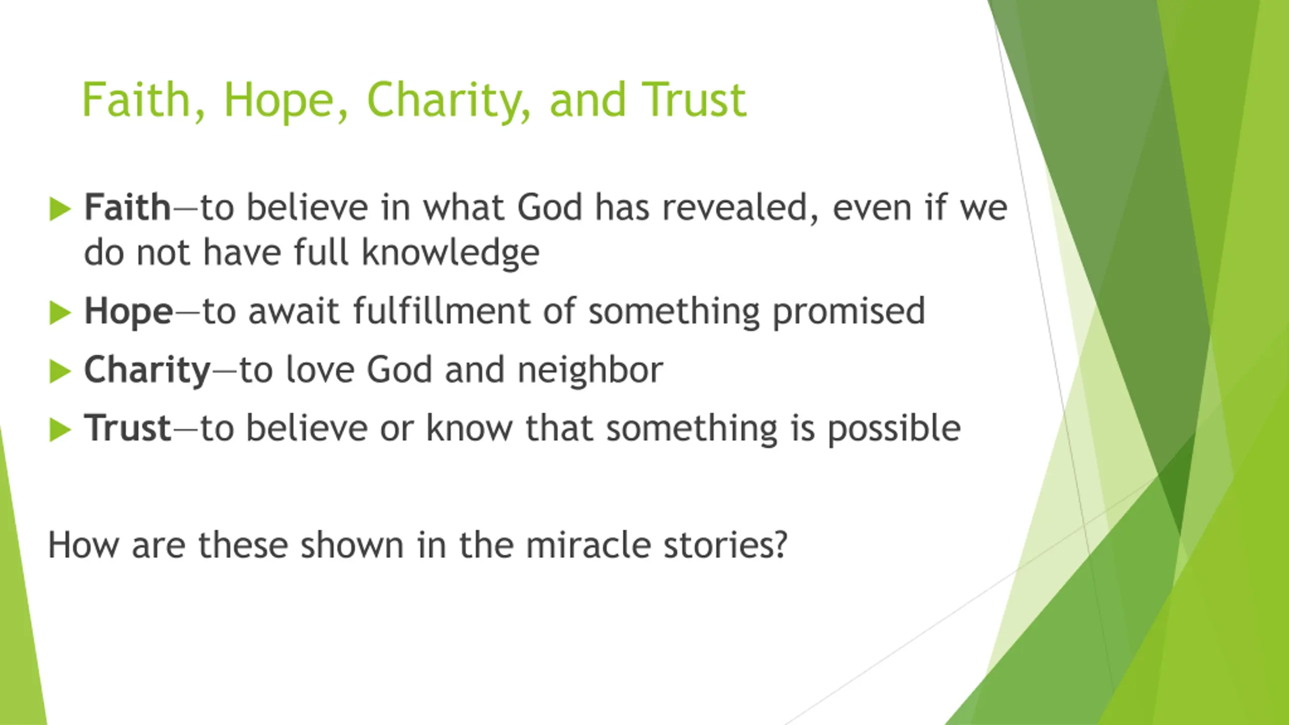 Faith, Hope, Charity, and Trust Faith to believe in what God has revealed, even if we do not have full knowledge Hope to await fulfillment of something promised Charity to love God and neighbor Trust to believe or know that something is possible How are these shown in the miracle stories?