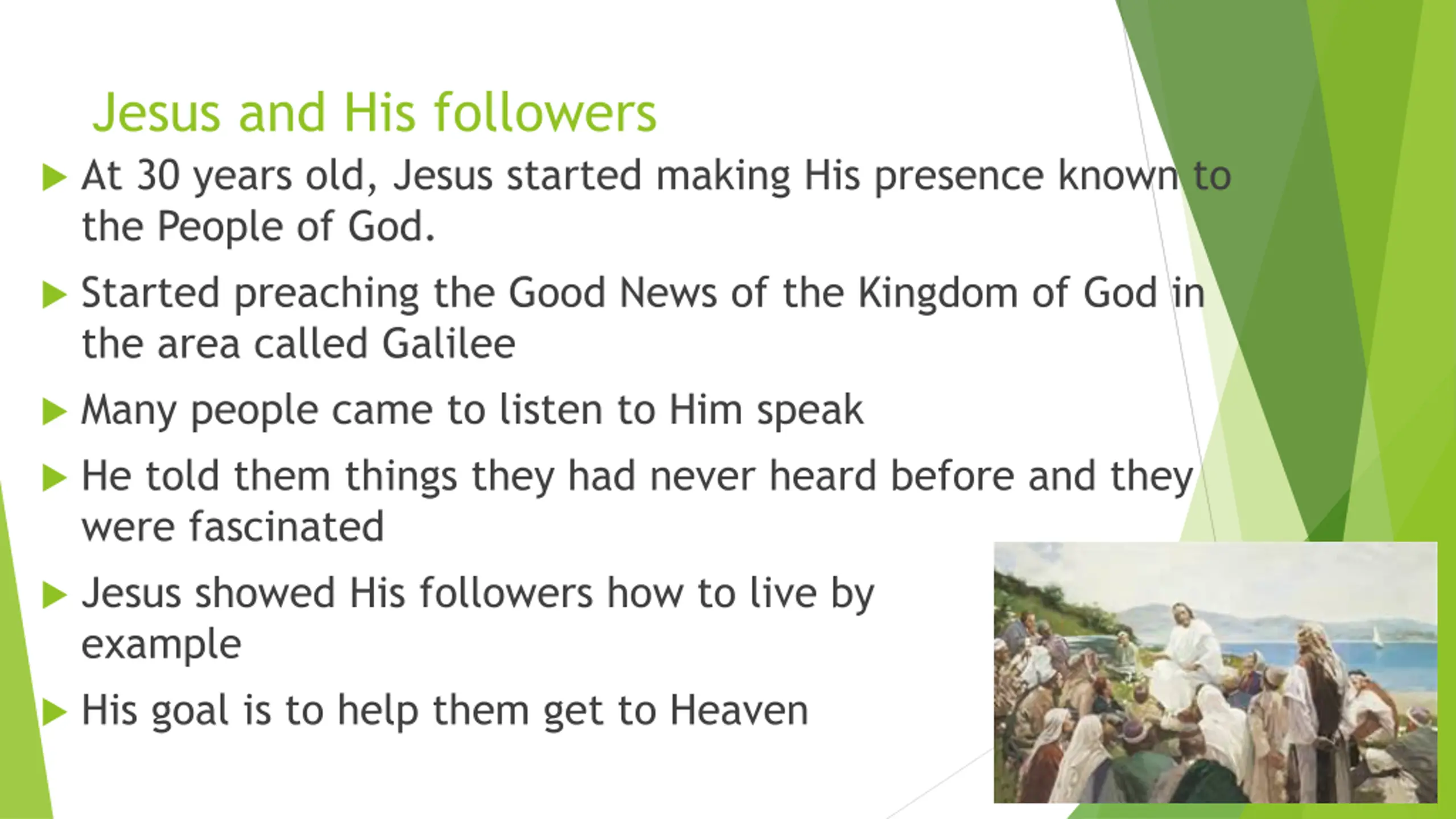 Jesus and His followers At 30 years old, Jesus started making His presence known to the People of God. Started preaching the Good News of the Kingdom of God in the area called Galilee Many people came to listen to Him speak He told them things they had never heard before and they were fascinated Jesus showed His followers how to live by example His goal is to help them get to Heaven His