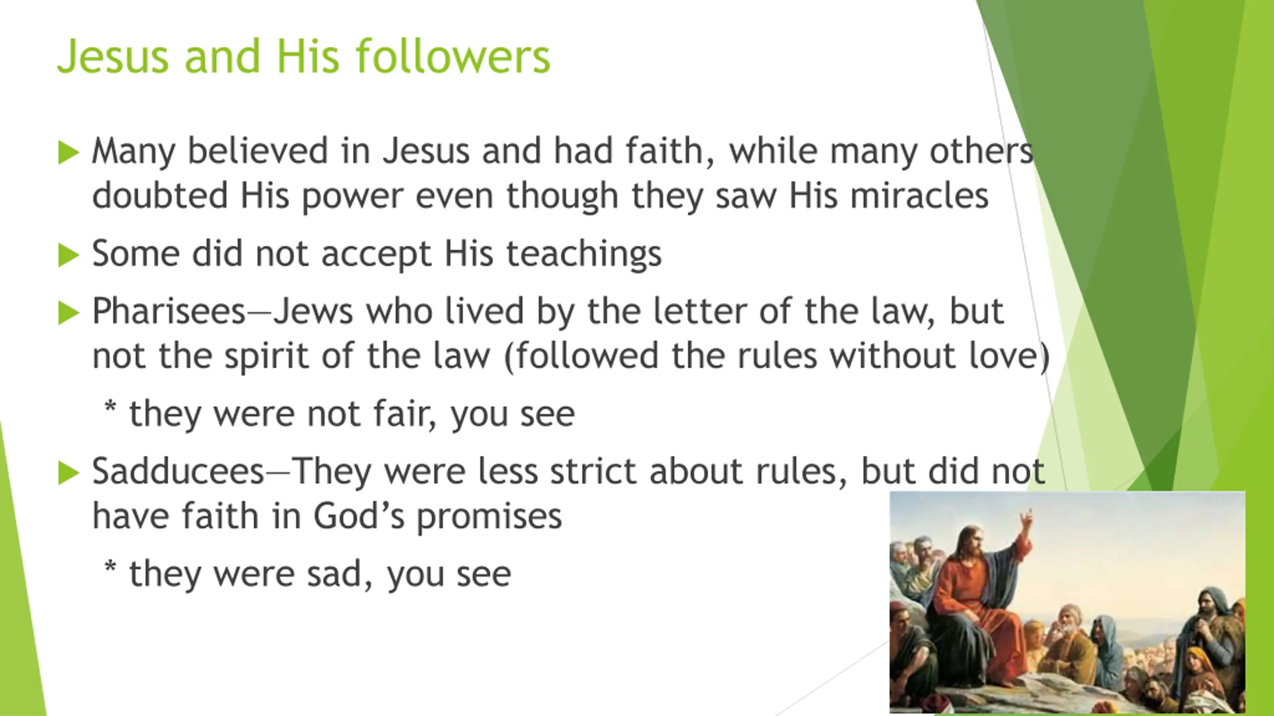 Jesus and His followers Many believed in Jesus and had faith, while many others doubted His power even though they saw His miracles Some did not accept His teachings Pharisees Jews who lived by the letter of the law, but not the spirit of the law (followed the rules without love) * they were not fair, you see Sadducees They were less strict about rules, but did not have faith in God s promises * they were sad, you see
