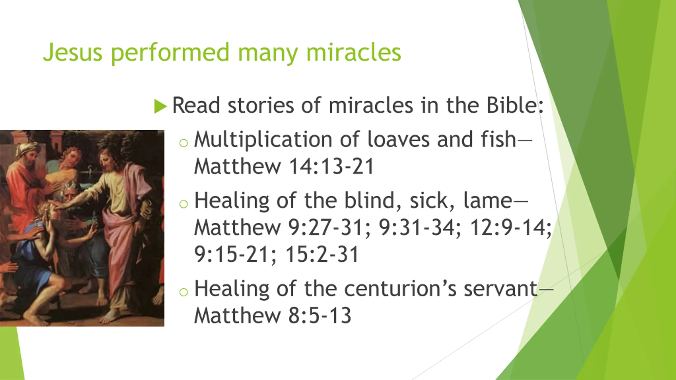 Jesus performed many miracles Read stories of miracles in the Bible: o Multiplication of loaves and fish Matthew 14:13-21 o Healing of the blind, sick, lame Matthew 9:27-31; 9:31-34; 12:9-14; 9:15-21; 15:2-31 o Healing of the centurion s servant Matthew 8:5-13