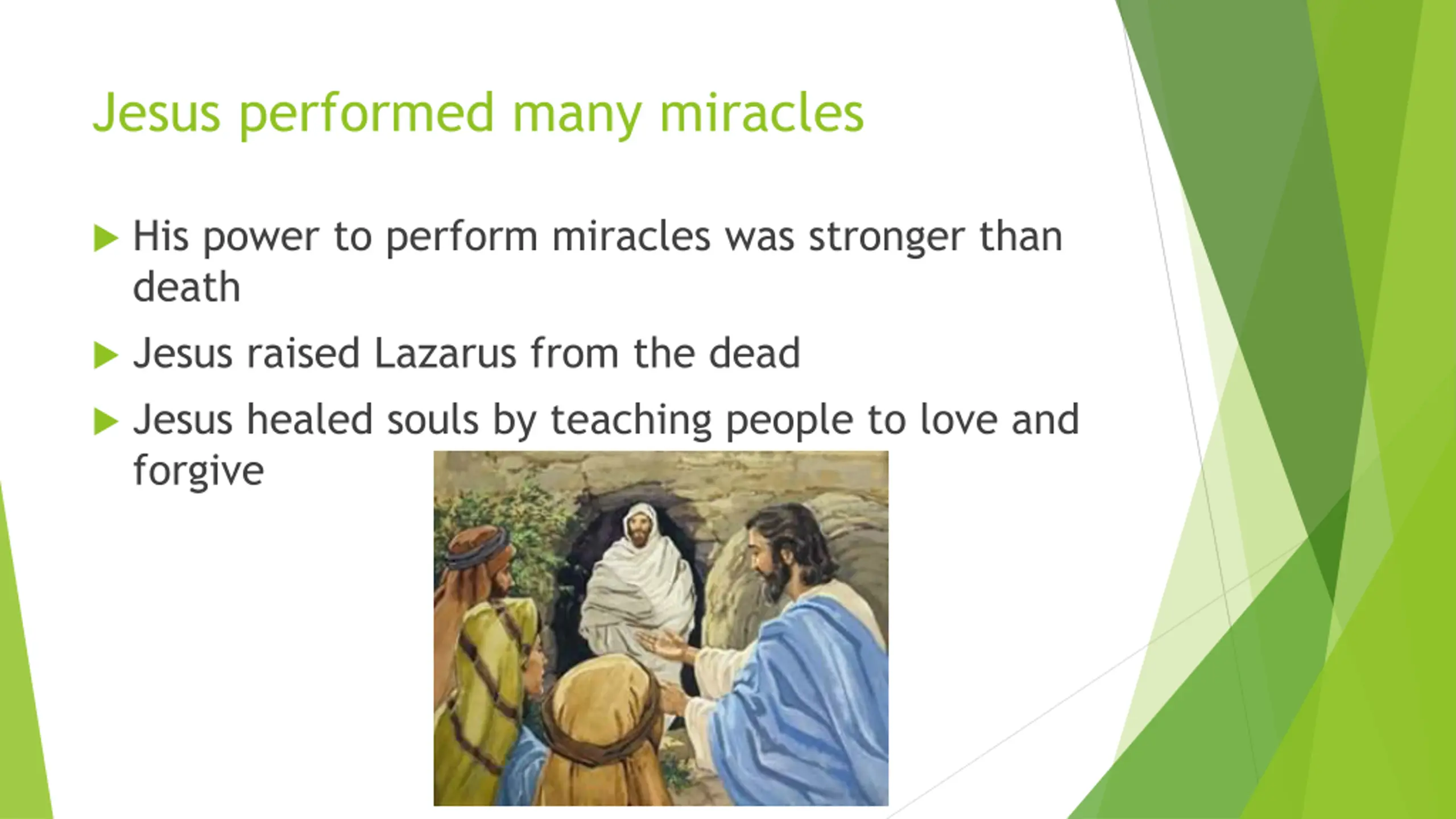 Jesus performed many miracles His power to perform miracles was stronger than death Jesus raised Lazarus from the dead Jesus healed souls by teaching people to love and forgive