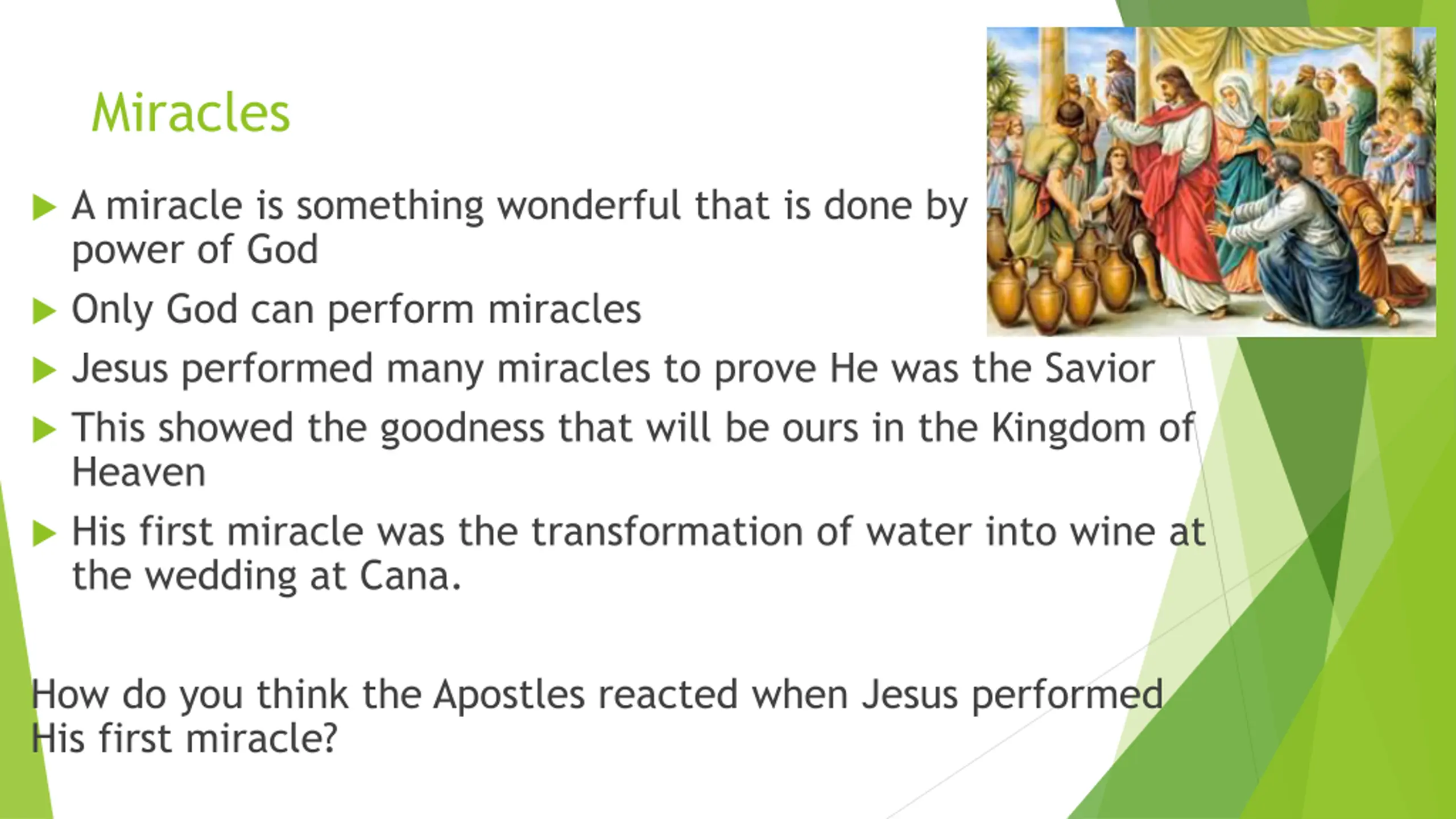 Miracles A miracle is something wonderful that is done by power of God Only God can perform miracles Jesus performed many miracles to prove He was the Savior This showed the goodness that will be ours in the Kingdom of Heaven His first miracle was the transformation of water into wine at the wedding at Cana. the How do you think the Apostles reacted when Jesus performed His first miracle?