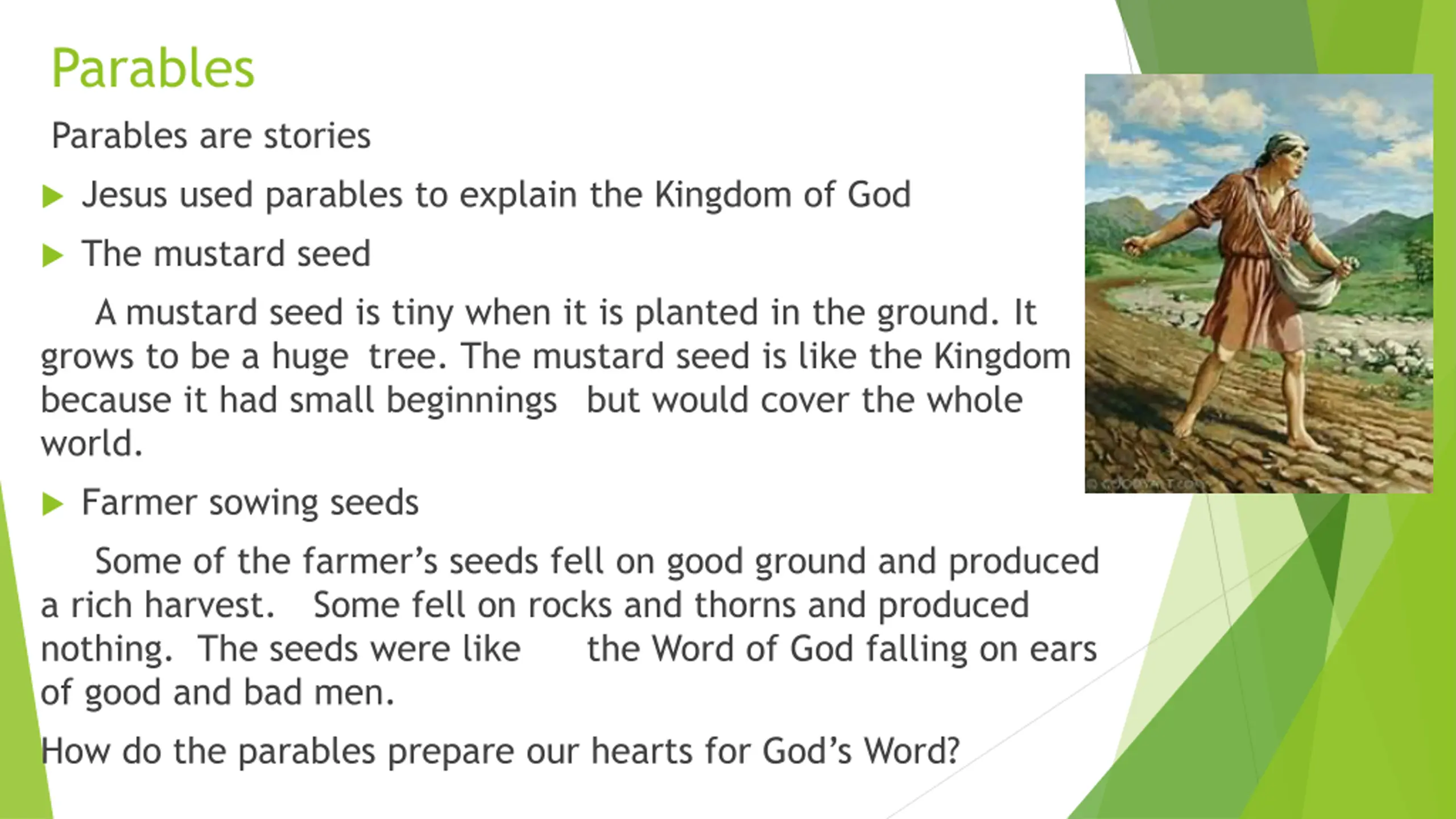 Parables Parables are stories Jesus used parables to explain the Kingdom of God The mustard seed A mustard seed is tiny when it is planted in the ground. It grows to be a huge tree. The mustard seed is like the Kingdom because it had small beginnings but would cover the whole world. Farmer sowing seeds Some of the farmer s seeds fell on good ground and produced a rich harvest. Some fell on rocks and thorns and produced nothing. The seeds were like of good and bad men. How do the parables prepare our hearts for God s Word? the Word of God falling on ears