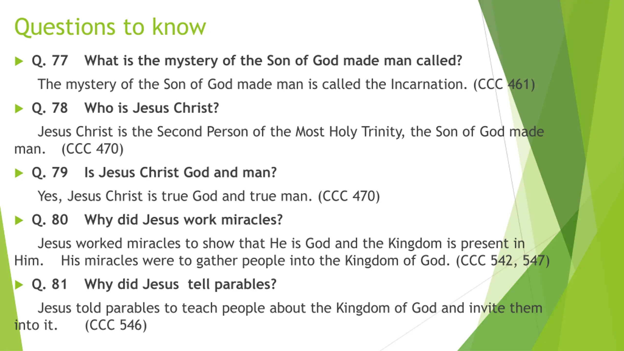 Questions to know Q. 77 What is the mystery of the Son of God made man called? The mystery of the Son of God made man is called the Incarnation. (CCC 461) Q. 78 Who is Jesus Christ? Jesus Christ is the Second Person of the Most Holy Trinity, the Son of God made man. (CCC 470) Q. 79 Is Jesus Christ God and man? Yes, Jesus Christ is true God and true man. (CCC 470) Q. 80 Why did Jesus work miracles? Jesus worked miracles to show that He is God and the Kingdom is present in Him. His miracles were to gather people into the Kingdom of God. (CCC 542, 547) Q. 81 Why did Jesus tell parables? Jesus told parables to teach people about the Kingdom of God and invite them into it. (CCC 546)