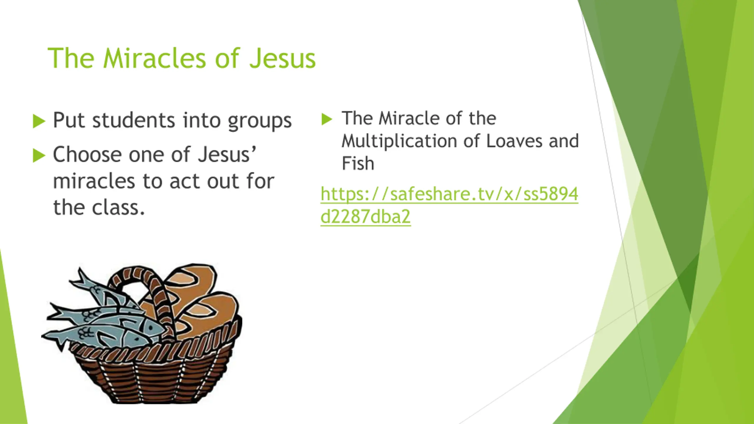 The Miracles of Jesus The Miracle of the Multiplication of Loaves and Fish https://safeshare.tv/x/ss5894 d2287dba2 Put students into groups Choose one of Jesus miracles to act out for the class.