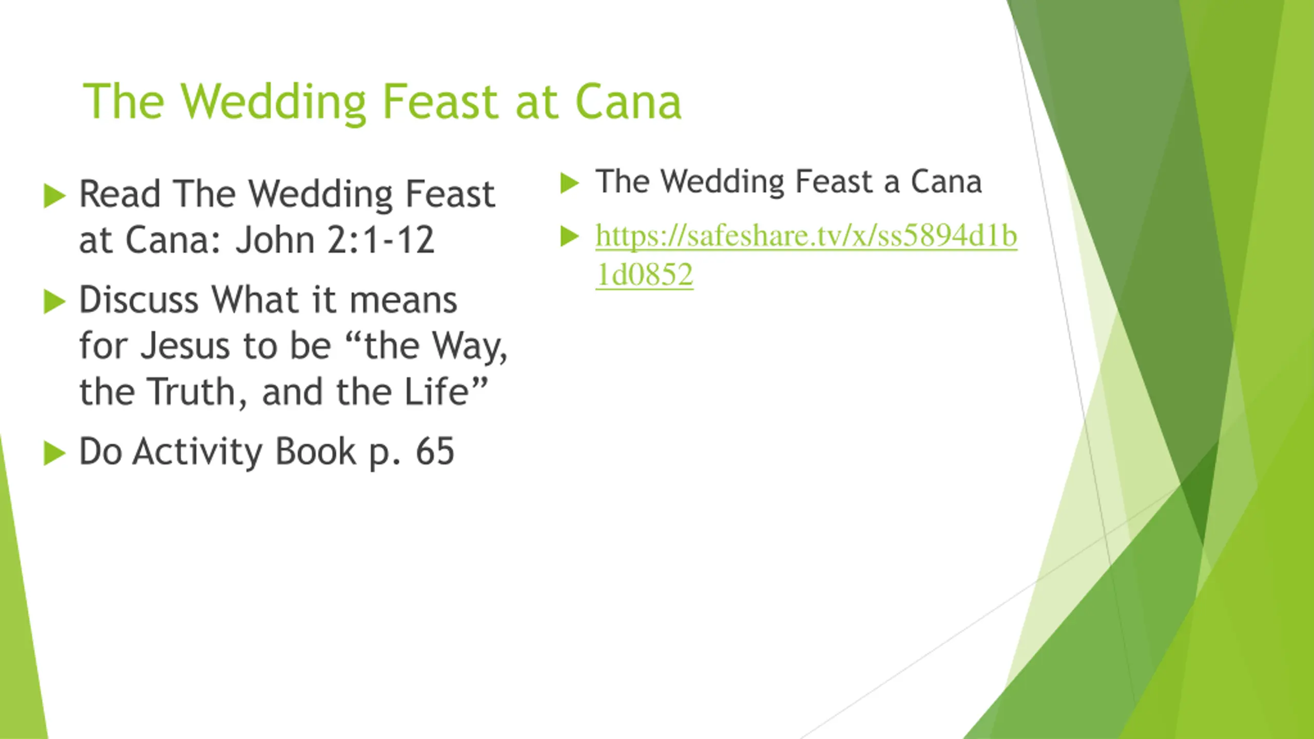 The Wedding Feast at Cana The Wedding Feast a Cana Read The Wedding Feast at Cana: John 2:1-12 Discuss What it means for Jesus to be the Way, the Truth, and the Life Do Activity Book p. 65 https://safeshare.tv/x/ss5894d1b 1d0852