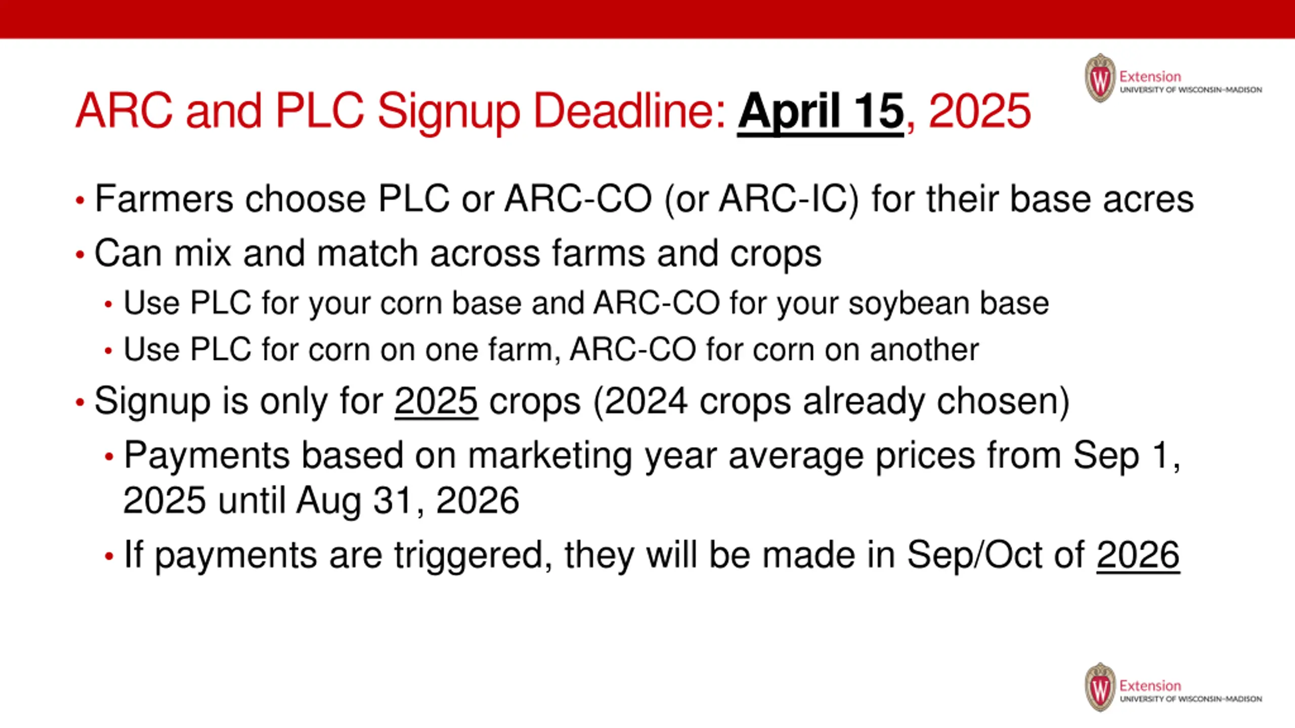 ARC and PLC Signup Deadline: April 15, 2025 Farmers choose PLC or ARC-CO (or ARC-IC) for their base acres Can mix and match across farms and crops Use PLC for your corn base and ARC-CO for your soybean base Use PLC for corn on one farm, ARC-CO for corn on another Signup is only for 2025 crops (2024 crops already chosen) Payments based on marketing year average prices from Sep 1, 2025 until Aug 31, 2026 If payments are triggered, they will be made in Sep/Oct of 2026