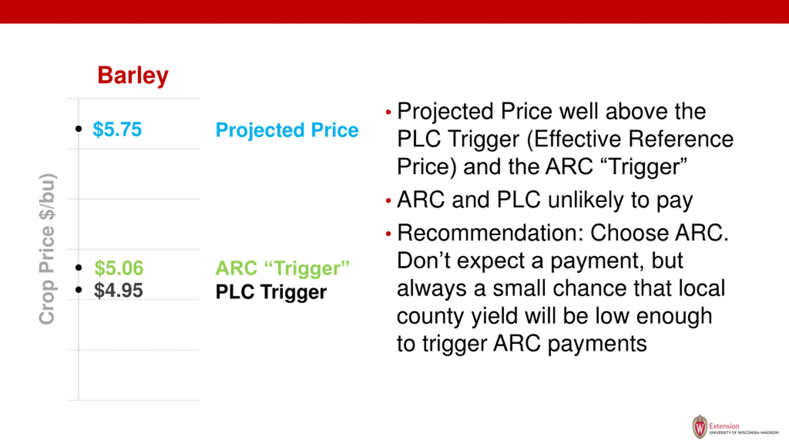 Barley Projected Price well above the PLC Trigger (Effective Reference Price) and the ARC Trigger ARC and PLC unlikely to pay Recommendation: Choose ARC. Don t expect a payment, but always a small chance that local county yield will be low enough to trigger ARC payments $5.75 Projected Price Crop Price $/bu) ARC Trigger PLC Trigger $5.06 $4.95