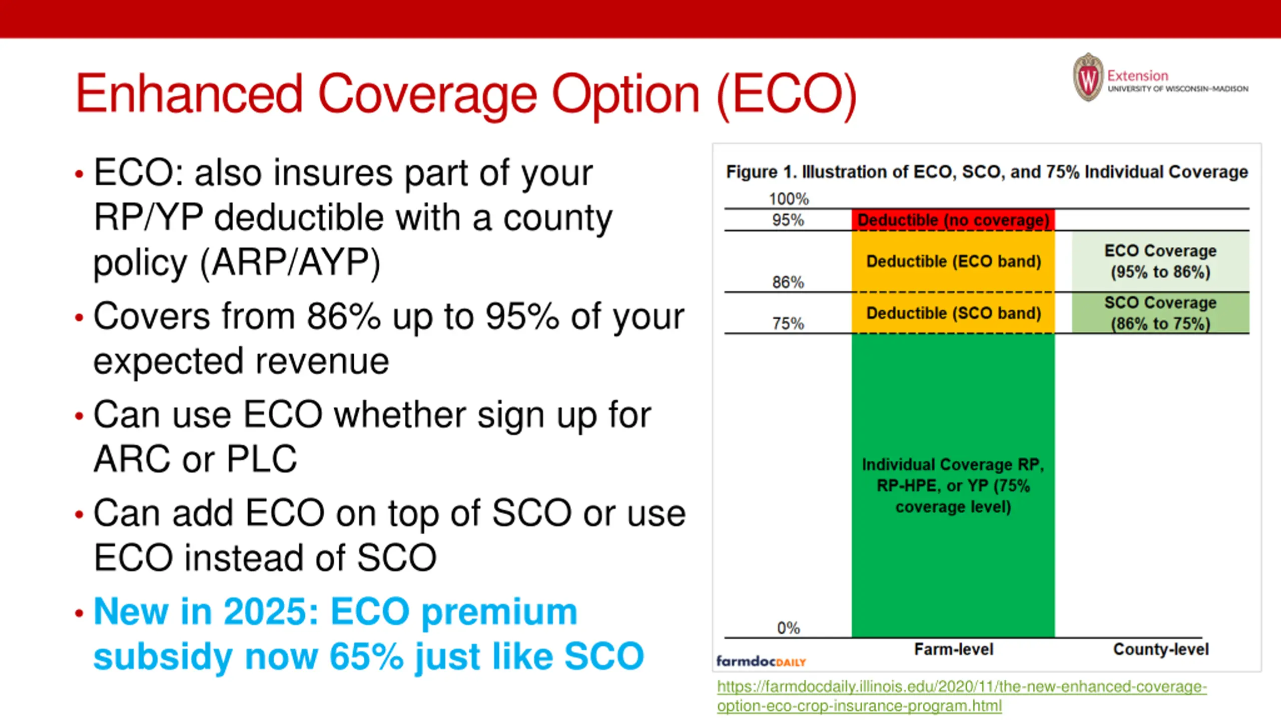 Enhanced Coverage Option (ECO) ECO: also insures part of your RP/YP deductible with a county policy (ARP/AYP) Covers from 86% up to 95% of your expected revenue Can use ECO whether sign up for ARC or PLC Can add ECO on top of SCO or use ECO instead of SCO New in 2025: ECO premium subsidy now 65% just like SCO https://farmdocdaily.illinois.edu/2020/11/the-new-enhanced-coverage- option-eco-crop-insurance-program.html
