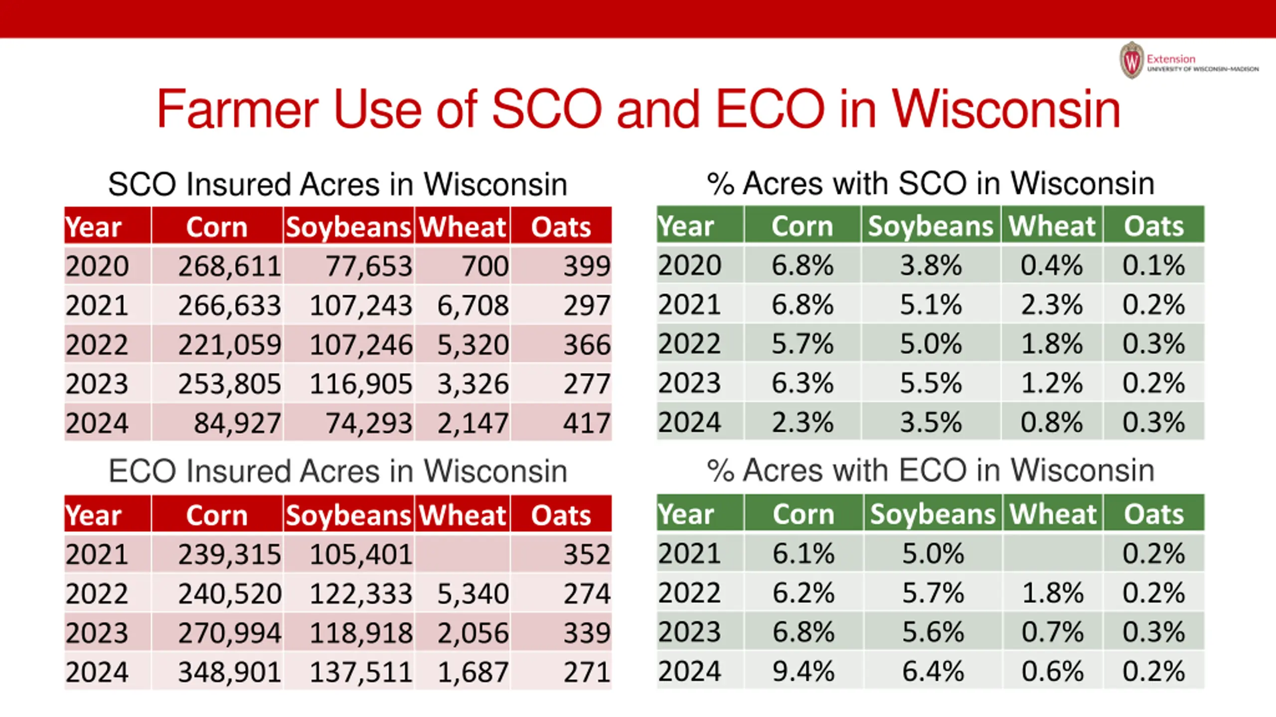 Farmer Use of SCO and ECO in Wisconsin % Acres with SCO in Wisconsin SCO Insured Acres in Wisconsin Year 2020 2021 2022 2023 2024 Corn 6.8% 6.8% 5.7% 6.3% 2.3% Soybeans Wheat Oats 3.8% 0.4% 5.1% 2.3% 5.0% 1.8% 5.5% 1.2% 3.5% 0.8% Year 2020 2021 2022 2023 2024 Corn 268,611 266,633 107,243 6,708 221,059 107,246 5,320 253,805 116,905 3,326 84,927 74,293 2,147 ECO Insured Acres in Wisconsin SoybeansWheat Oats 77,653 0.1% 0.2% 0.3% 0.2% 0.3% 700 399 297 366 277 417 % Acres with ECO in Wisconsin Year 2021 2022 2023 2024 Corn 6.1% 6.2% 6.8% 9.4% Soybeans Wheat Oats 5.0% 5.7% 1.8% 5.6% 0.7% 6.4% 0.6% Year 2021 2022 2023 2024 Corn 239,315 105,401 240,520 122,333 5,340 270,994 118,918 2,056 348,901 137,511 1,687 SoybeansWheat Oats 0.2% 0.2% 0.3% 0.2% 352 274 339 271