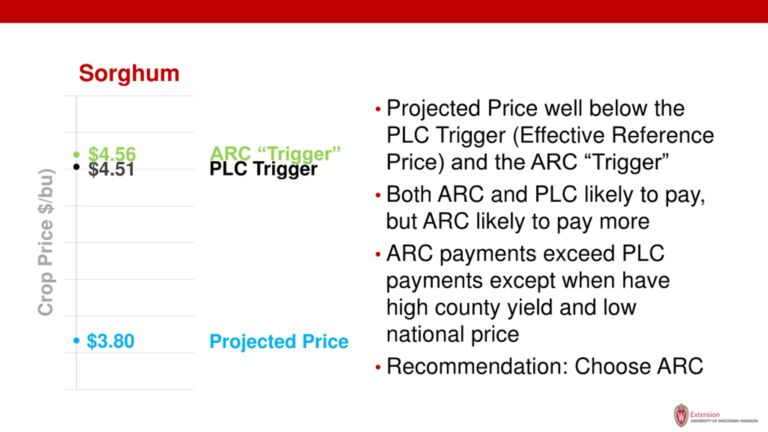 Sorghum Projected Price well below the PLC Trigger (Effective Reference Price) and the ARC Trigger Both ARC and PLC likely to pay, but ARC likely to pay more ARC payments exceed PLC payments except when have high county yield and low national price Recommendation: Choose ARC ARC Trigger $4.56 PLC Trigger $4.51 Crop Price $/bu) Projected Price $3.80