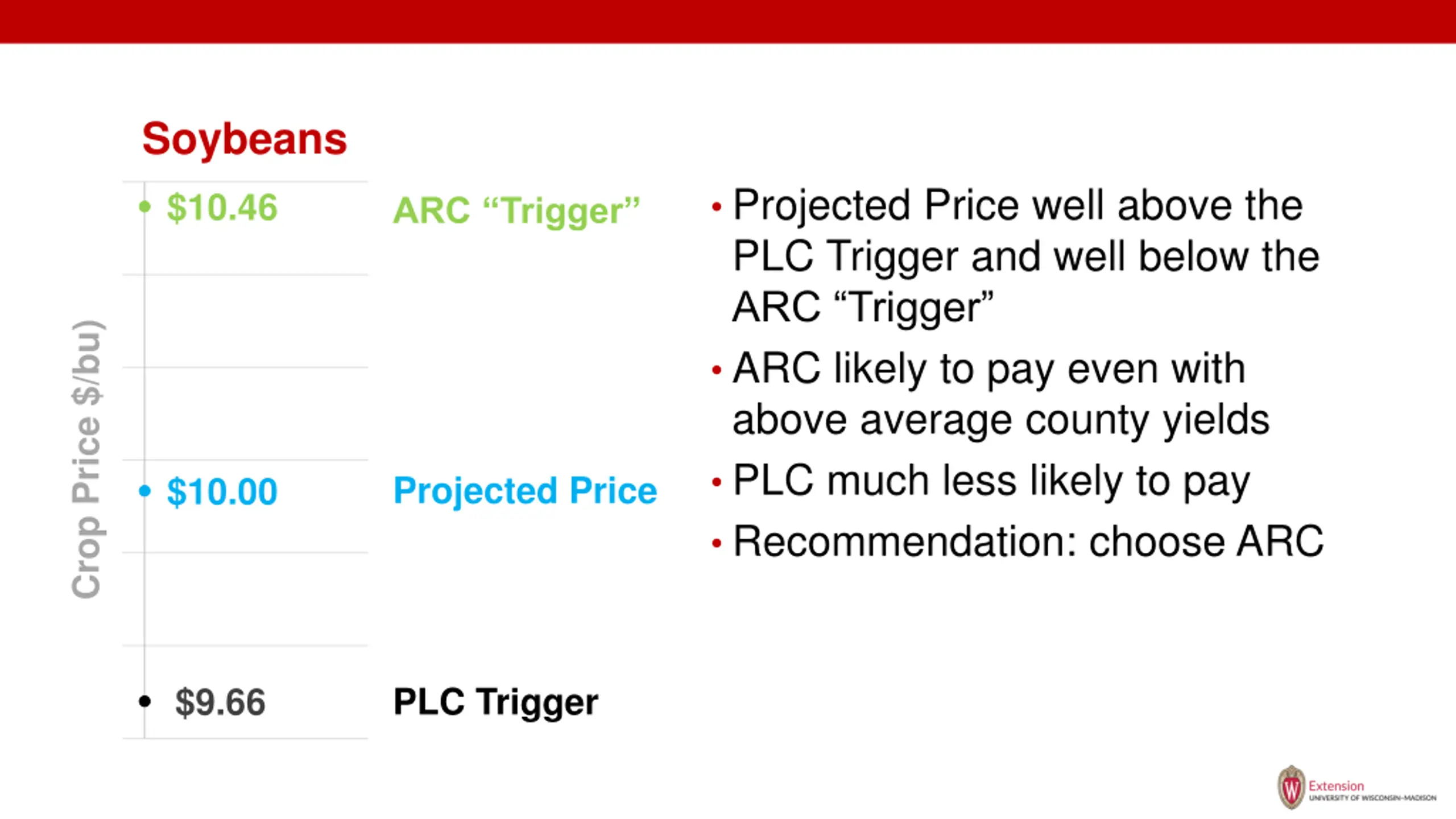 Soybeans Projected Price well above the PLC Trigger and well below the ARC Trigger ARC likely to pay even with above average county yields PLC much less likely to pay Recommendation: choose ARC $10.46 ARC Trigger Crop Price $/bu) Projected Price $10.00 PLC Trigger $9.66