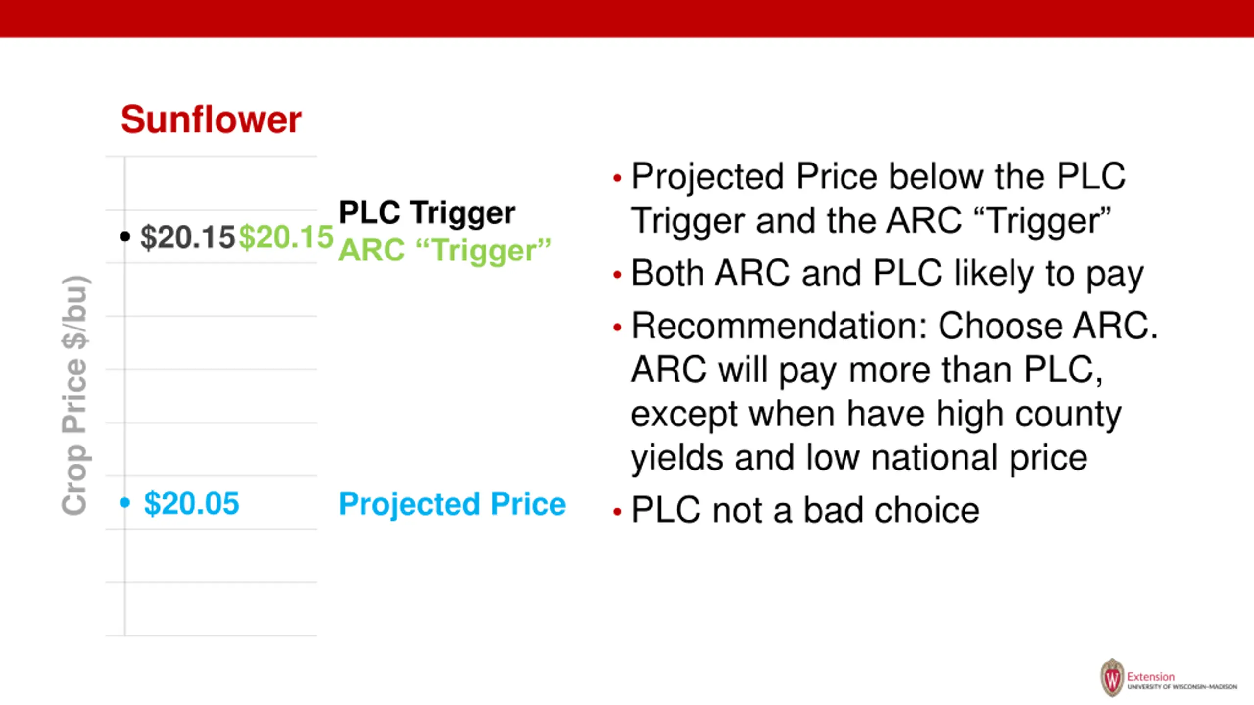 Sunflower Projected Price below the PLC Trigger and the ARC Trigger Both ARC and PLC likely to pay Recommendation: Choose ARC. ARC will pay more than PLC, except when have high county yields and low national price PLC not a bad choice PLC Trigger ARC Trigger $20.15 $20.15 Crop Price $/bu) Projected Price $20.05