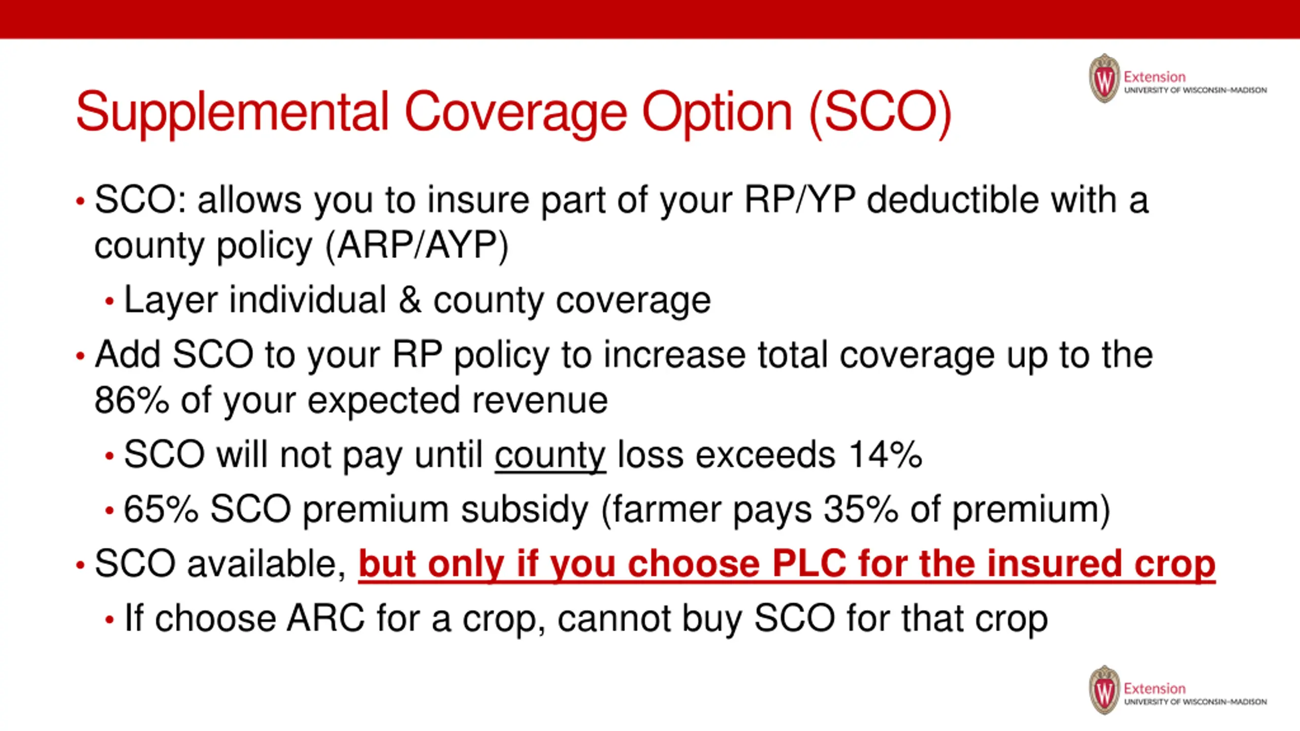 Supplemental Coverage Option (SCO) SCO: allows you to insure part of your RP/YP deductible with a county policy (ARP/AYP) Layer individual & county coverage Add SCO to your RP policy to increase total coverage up to the 86% of your expected revenue SCO will not pay until county loss exceeds 14% 65% SCO premium subsidy (farmer pays 35% of premium) SCO available, but only if you choose PLC for the insured crop If choose ARC for a crop, cannot buy SCO for that crop