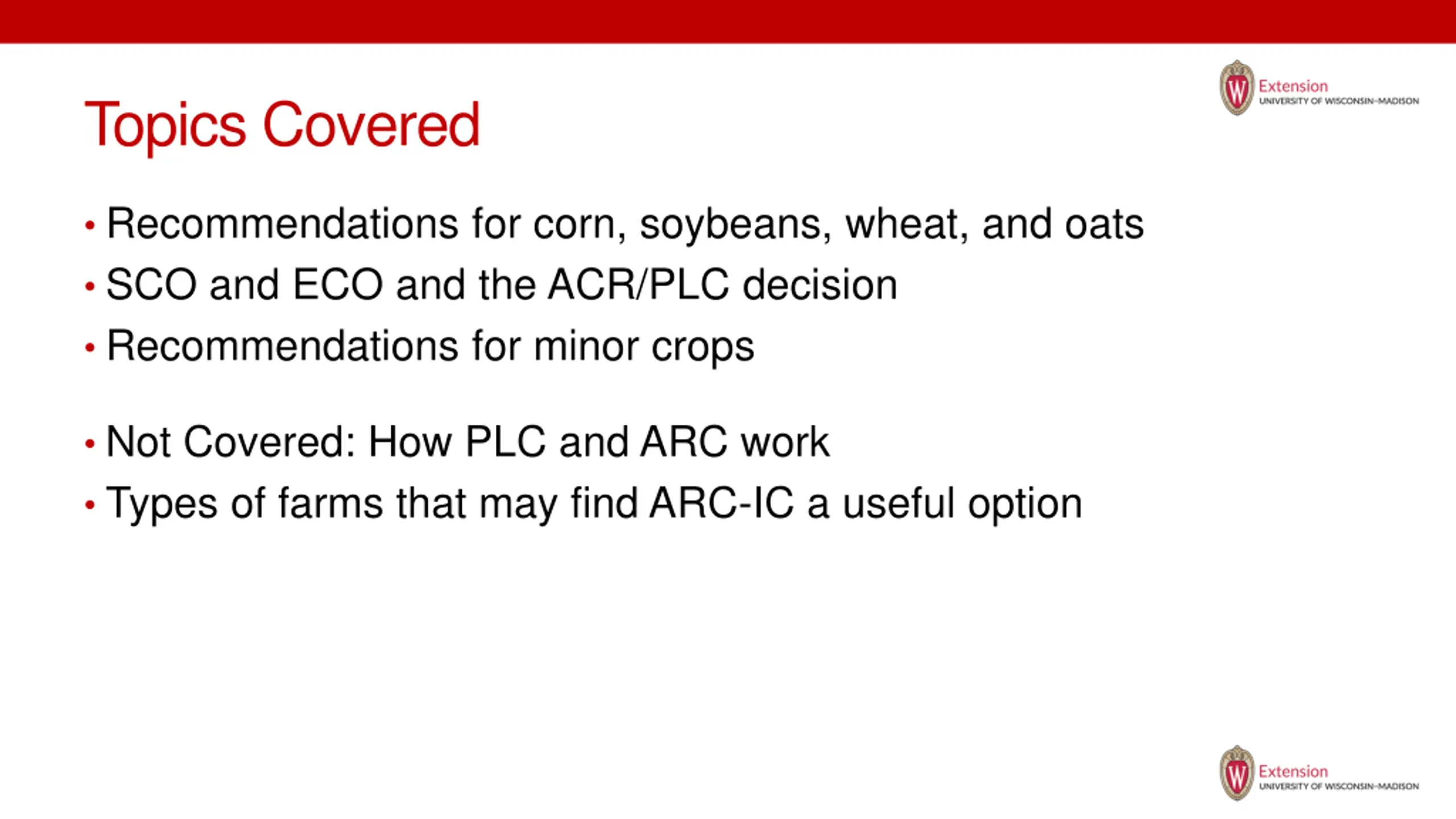 Topics Covered Recommendations for corn, soybeans, wheat, and oats SCO and ECO and the ACR/PLC decision Recommendations for minor crops Not Covered: How PLC and ARC work Types of farms that may find ARC-IC a useful option