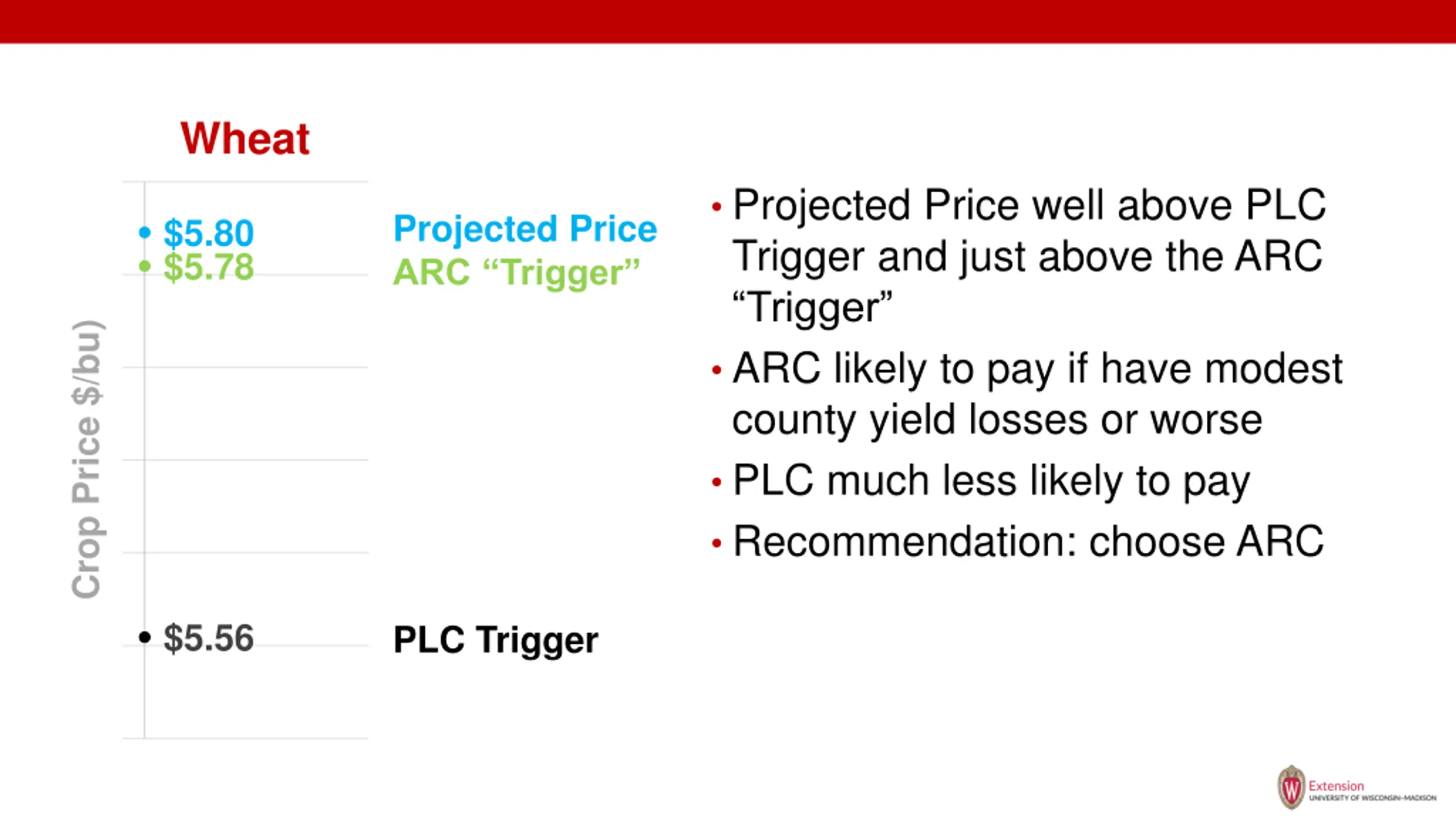 Wheat Projected Price well above PLC Trigger and just above the ARC Trigger ARC likely to pay if have modest county yield losses or worse PLC much less likely to pay Recommendation: choose ARC Projected Price ARC Trigger $5.80 $5.78 Crop Price $/bu) $5.56 PLC Trigger