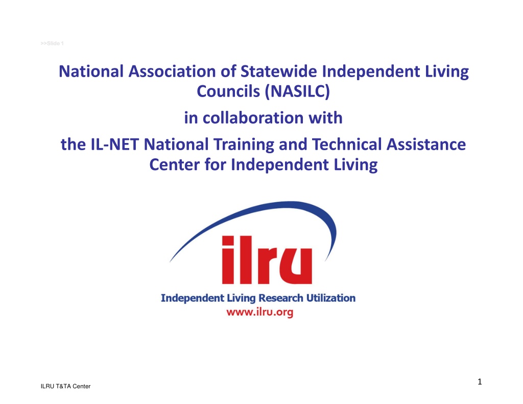 >>Slide >>Slide 1 1 National Association of Statewide Independent Living Councils (NASILC) in collaboration with the IL-NET National Training and Technical Assistance Center for Independent Living 1 ILRU T&TA Center