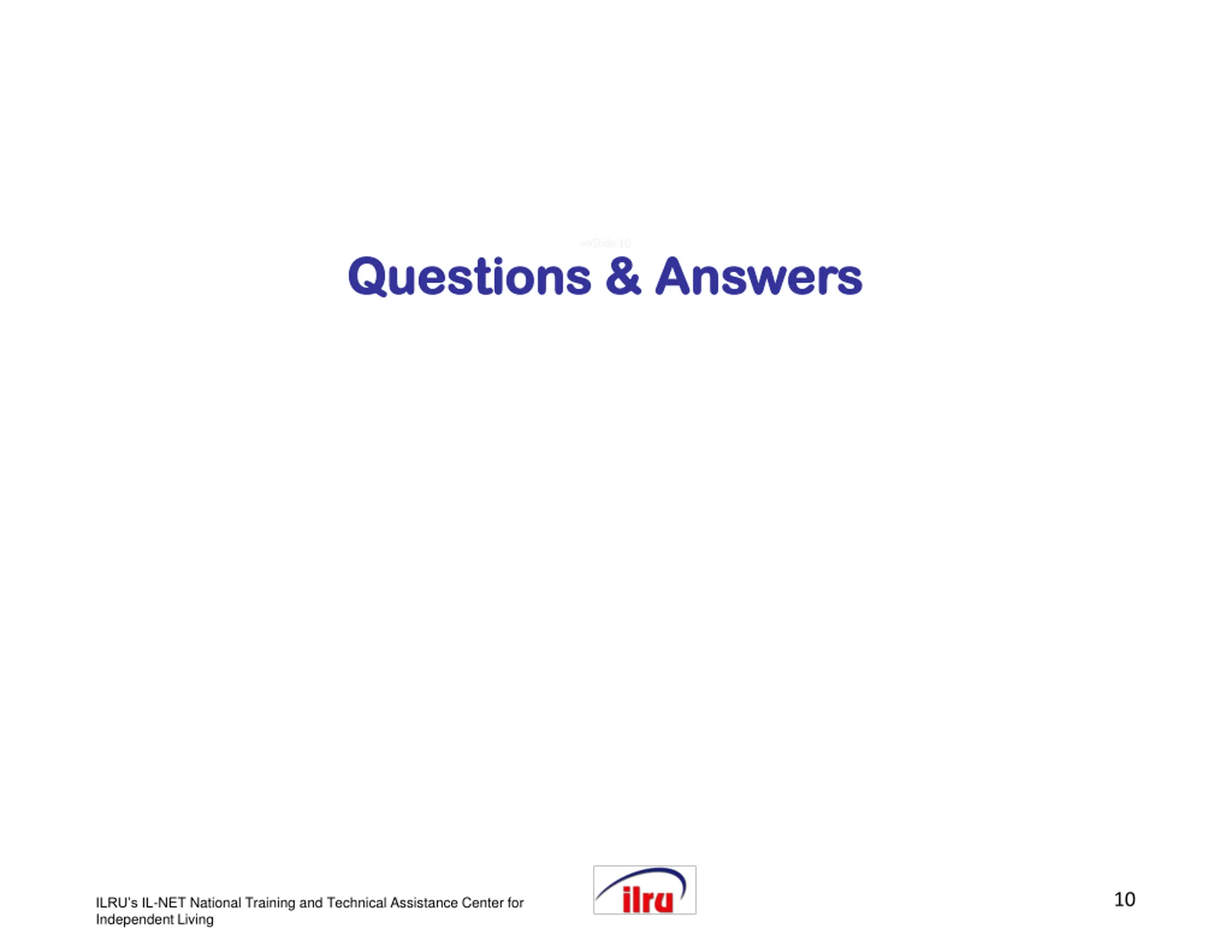 >>Slide 10 >>Slide 10 Questions & Answers Questions & Answers 10 ILRU s IL-NET National Training and Technical Assistance Center for Independent Living
