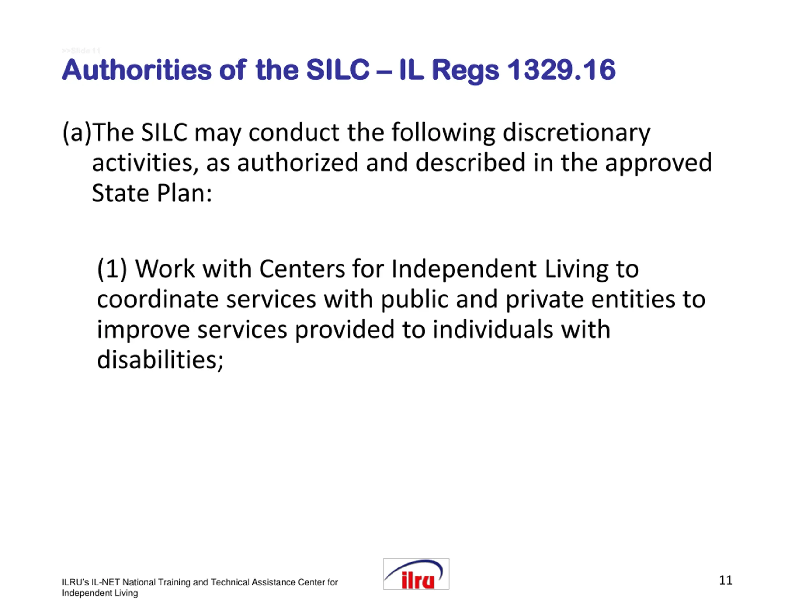 >>Slide 11 >>Slide 11 Authorities of the SILC Authorities of the SILC IL Regs 1329.16 IL Regs 1329.16 (a)The SILC may conduct the following discretionary activities, as authorized and described in the approved State Plan: (1) Work with Centers for Independent Living to coordinate services with public and private entities to improve services provided to individuals with disabilities; 11 ILRU s IL-NET National Training and Technical Assistance Center for Independent Living
