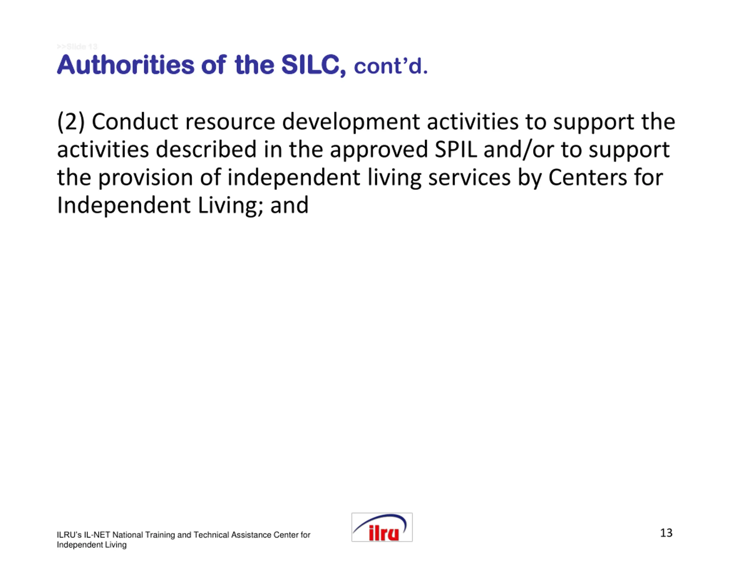 >>Slide 13 >>Slide 13 Authorities of the SILC, Authorities of the SILC, cont d. (2) Conduct resource development activities to support the activities described in the approved SPIL and/or to support the provision of independent living services by Centers for Independent Living; and 13 ILRU s IL-NET National Training and Technical Assistance Center for Independent Living