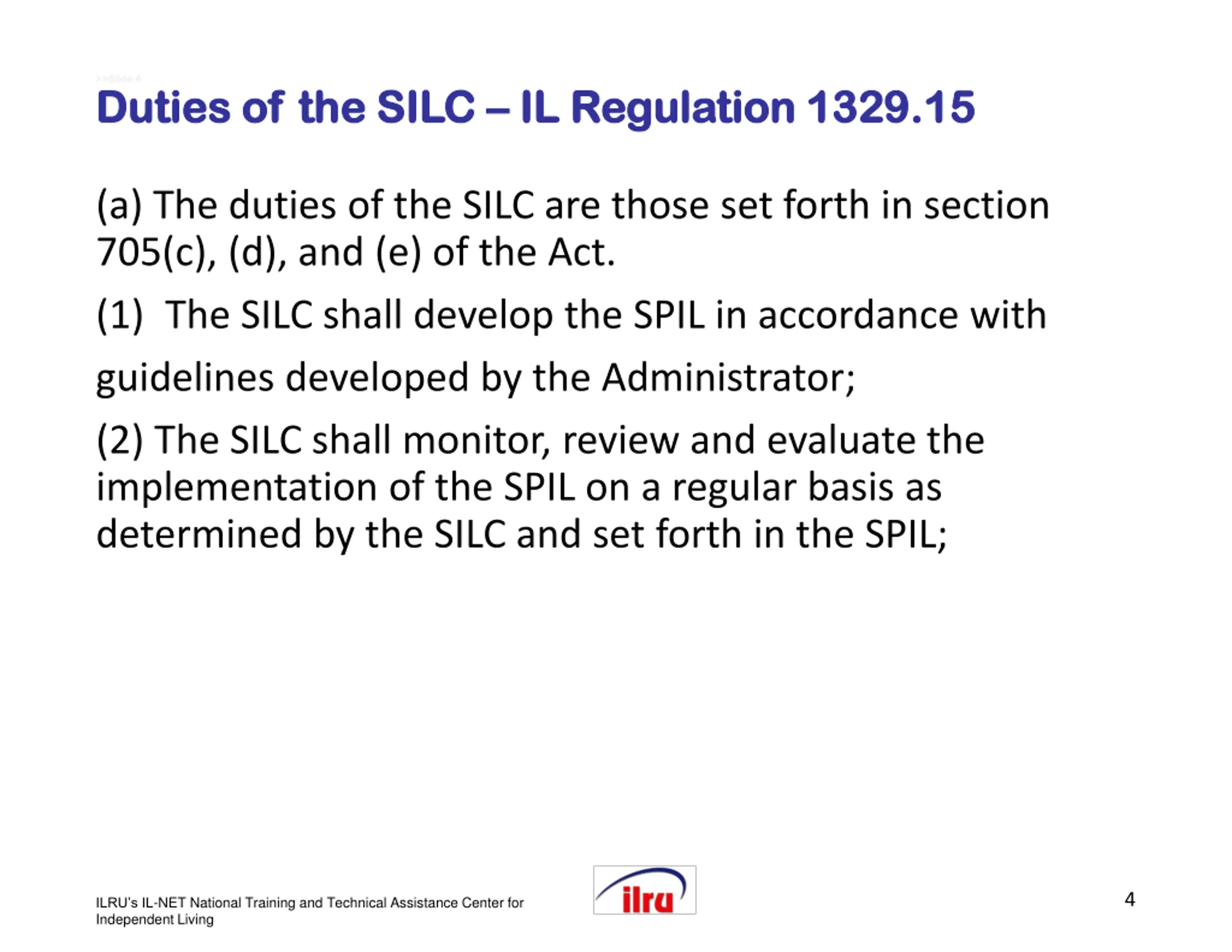 >>Slide 4 >>Slide 4 Duties of the SILC Duties of the SILC IL Regulation 1329.15 IL Regulation 1329.15 (a) The duties of the SILC are those set forth in section 705(c), (d), and (e) of the Act. (1) The SILC shall develop the SPIL in accordance with guidelines developed by the Administrator; (2) The SILC shall monitor, review and evaluate the implementation of the SPIL on a regular basis as determined by the SILC and set forth in the SPIL; 4 ILRU s IL-NET National Training and Technical Assistance Center for Independent Living