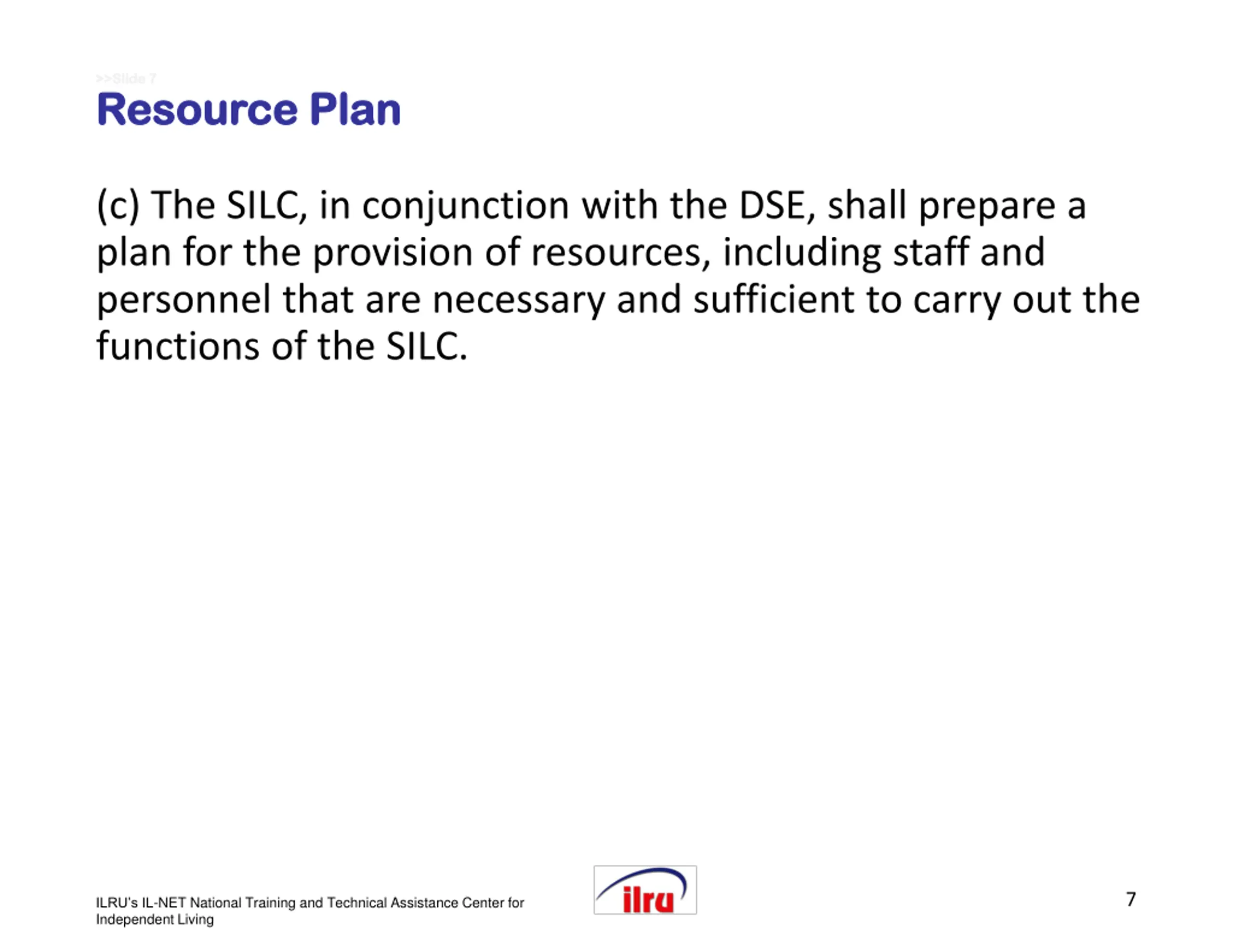 >>Slide 7 >>Slide 7 Resource Plan Resource Plan (c) The SILC, in conjunction with the DSE, shall prepare a plan for the provision of resources, including staff and personnel that are necessary and sufficient to carry out the functions of the SILC. 7 ILRU s IL-NET National Training and Technical Assistance Center for Independent Living