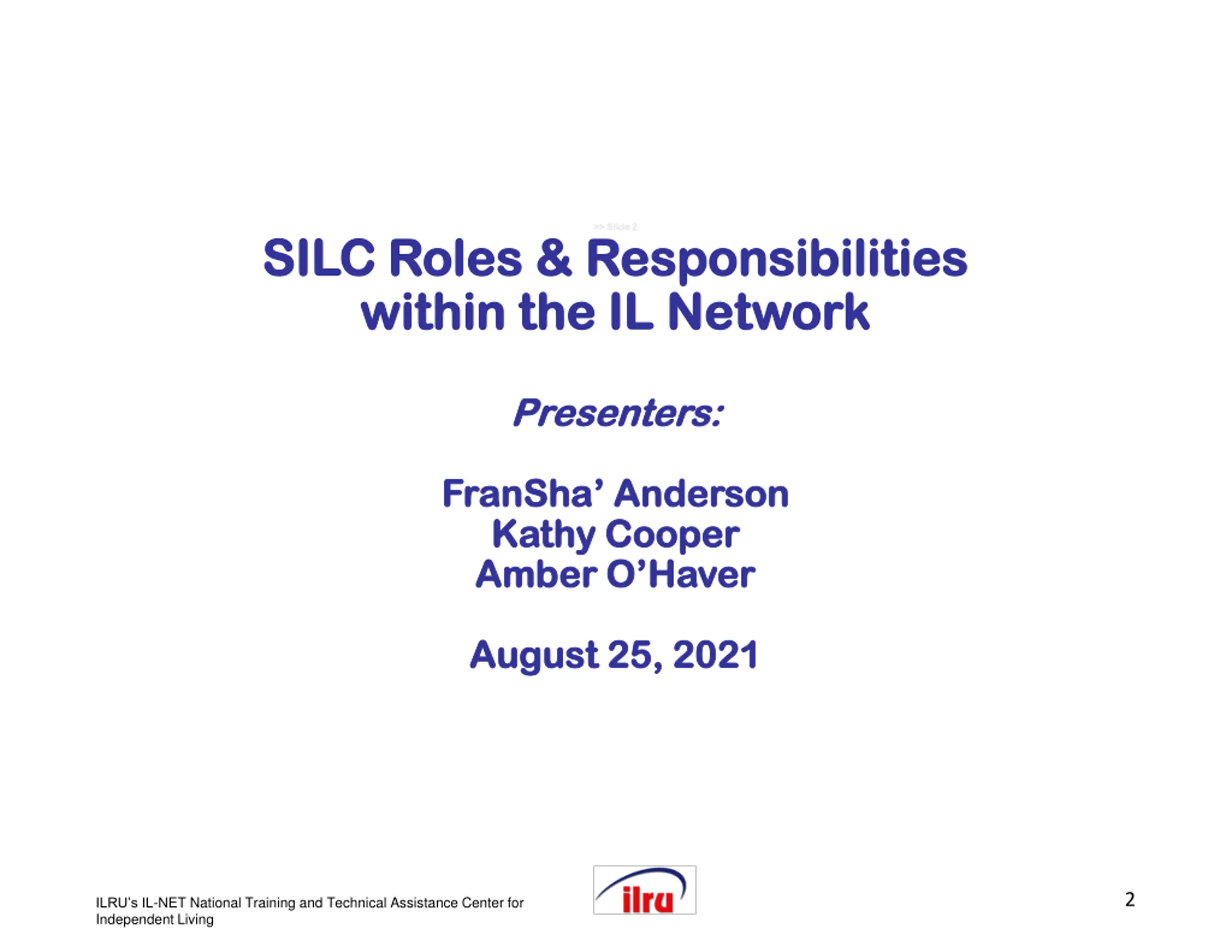 >> Slide >> Slide 2 2 SILC Roles & Responsibilities SILC Roles & Responsibilities within the IL Network within the IL Network Presenters: Presenters: FranSha FranSha Anderson Anderson Kathy Cooper Kathy Cooper Amber O Haver Amber O Haver August 25, 2021 August 25, 2021 2 ILRU s IL-NET National Training and Technical Assistance Center for Independent Living
