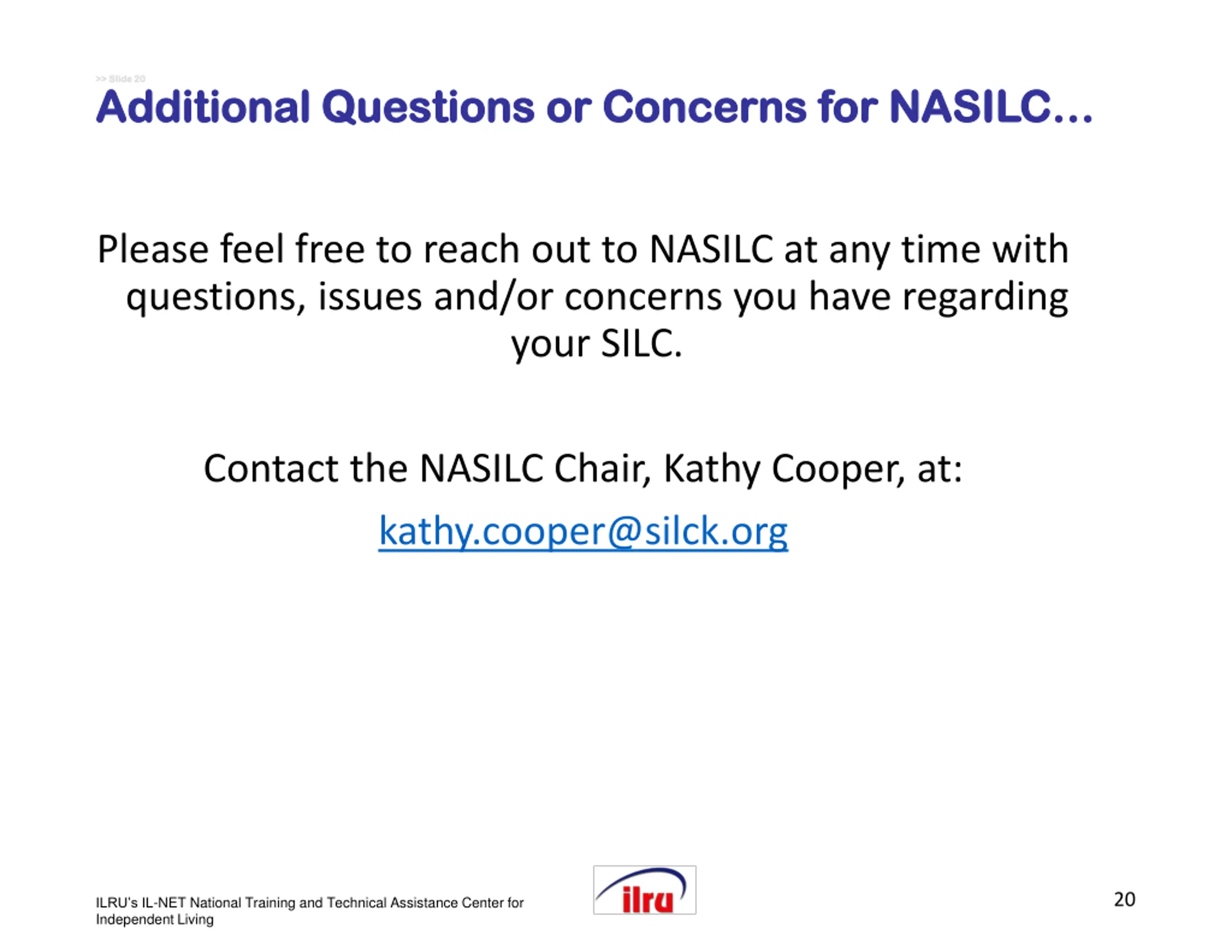 >> Slide >> Slide 20 Additional Questions or Concerns for NASILC Additional Questions or Concerns for NASILC 20 Please feel free to reach out to NASILC at any time with questions, issues and/or concerns you have regarding your SILC. Contact the NASILC Chair, Kathy Cooper, at: kathy.cooper@silck.org 20 ILRU s IL-NET National Training and Technical Assistance Center for Independent Living