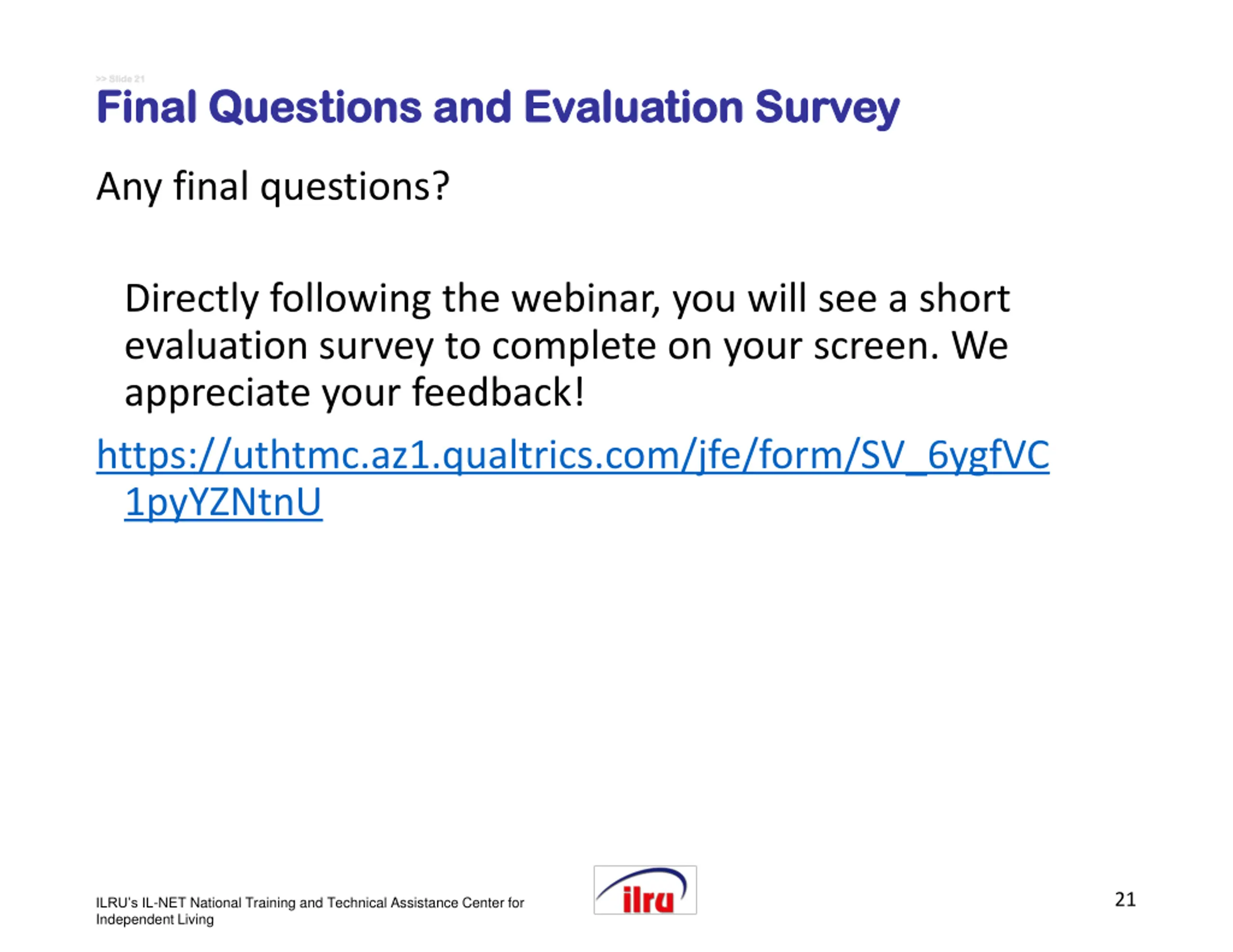 >> Slide >> Slide 21 Final Questions and Evaluation Survey Final Questions and Evaluation Survey 21 Any final questions? Directly following the webinar, you will see a short evaluation survey to complete on your screen. We appreciate your feedback! https://uthtmc.az1.qualtrics.com/jfe/form/SV_6ygfVC 1pyYZNtnU 21 ILRU s IL-NET National Training and Technical Assistance Center for Independent Living