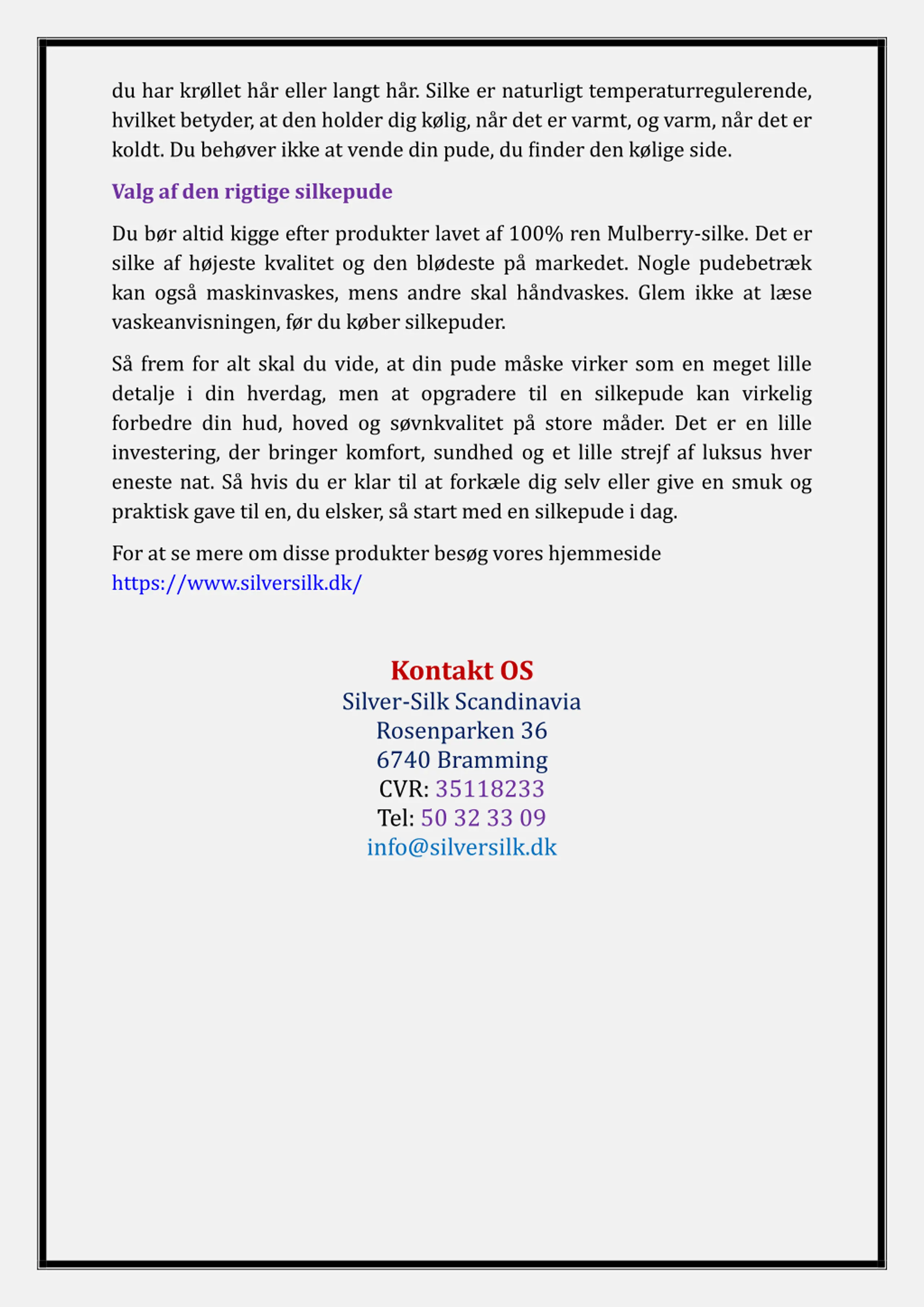 du har krllet ha r eller langt ha r. Silke er naturligt temperaturregulerende, hvilket betyder, at den holder dig k lig, na r det er varmt, og varm, na r det er koldt. Du beh ver ikke at vende din pude, du finder den k lige side. Valg af den rigtige silkepude Du b r altid kigge efter produkter lavet af 100% ren Mulberry-silke. Det er silke af h jeste kvalitet og den bl deste pa markedet. Nogle pudebetr k kan ogsa maskinvaskes, mens andre skal ha ndvaskes. Glem ikke at l se vaskeanvisningen, f r du k ber silkepuder. Sa frem for alt skal du vide, at din pude ma ske virker som en meget lille detalje i din hverdag, men at opgradere til en silkepude kan virkelig forbedre din hud, hoved og s vnkvalitet pa store ma der. Det er en lille investering, der bringer komfort, sundhed og et lille strejf af luksus hver eneste nat. Sa hvis du er klar til at fork le dig selv eller give en smuk og praktisk gave til en, du elsker, sa start med en silkepude i dag. For at se mere om disse produkter bes g vores hjemmeside https://www.silversilk.dk/ Kontakt OS Silver-Silk Scandinavia Rosenparken 36 6740 Bramming CVR: 35118233 Tel: 50 32 33 09 info@silversilk.dk