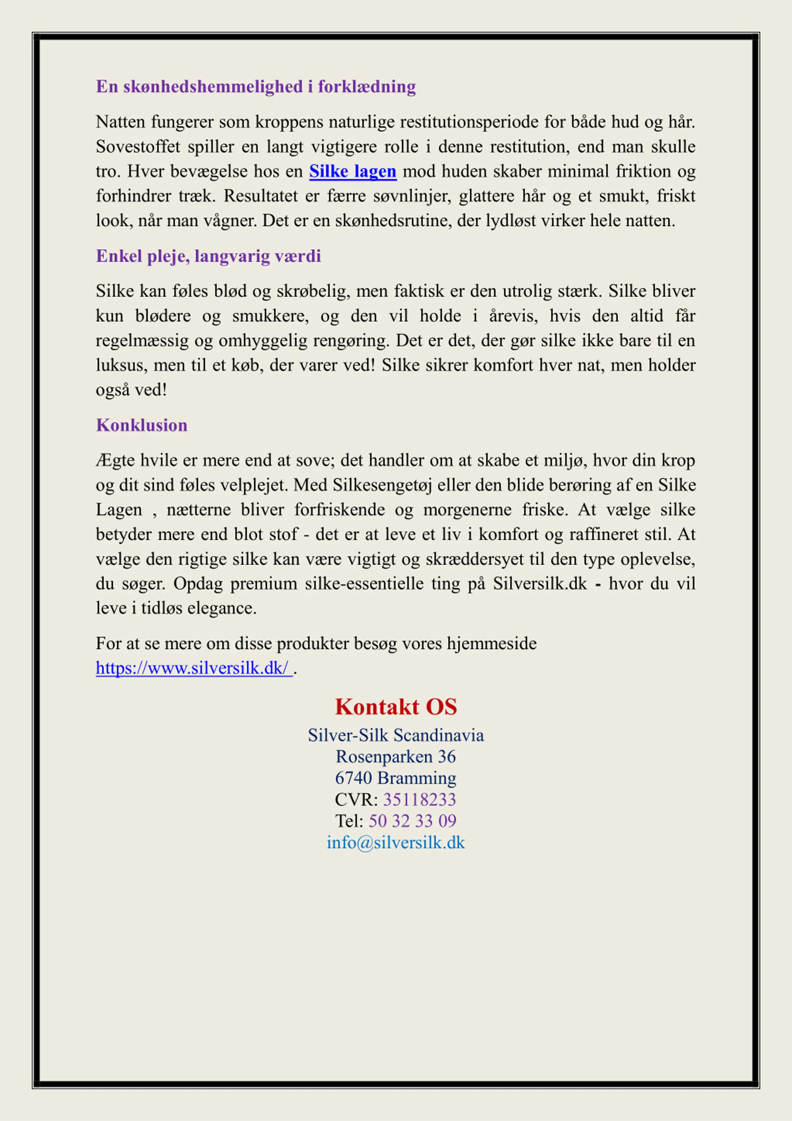 En sknhedshemmelighed i forkldning Natten fungerer som kroppens naturlige restitutionsperiode for b de hud og h r. Sovestoffet spiller en langt vigtigere rolle i denne restitution, end man skulle tro. Hver bev gelse hos en Silke lagen mod huden skaber minimal friktion og forhindrer tr k. Resultatet er f rre s vnlinjer, glattere h r og et smukt, friskt look, n r man v gner. Det er en sk nhedsrutine, der lydl st virker hele natten. Enkel pleje, langvarig v rdi Silke kan f les bl d og skr belig, men faktisk er den utrolig st rk. Silke bliver kun bl dere og smukkere, og den vil holde i revis, hvis den altid f r regelm ssig og omhyggelig reng ring. Det er det, der g r silke ikke bare til en luksus, men til et k b, der varer ved! Silke sikrer komfort hver nat, men holder ogs ved! Konklusion gte hvile er mere end at sove; det handler om at skabe et milj , hvor din krop og dit sind f les velplejet. Med Silkesenget jeller den blide ber ring af en Silke Lagen , n tterne bliver forfriskende og morgenerne friske. At v lge silke betyder mere end blot stof - det er at leve et liv i komfort og raffineret stil. At v lge den rigtige silke kan v re vigtigt og skr ddersyet til den type oplevelse, du s ger. Opdag premium silke-essentielle ting p Silversilk.dk -hvor du vil leve i tidl s elegance. For at se mere om disse produkter bes g vores hjemmeside https://www.silversilk.dk/ . Kontakt OS Silver-Silk Scandinavia Rosenparken 36 6740 Bramming CVR: 35118233 Tel: 50 32 33 09 info@silversilk.dk