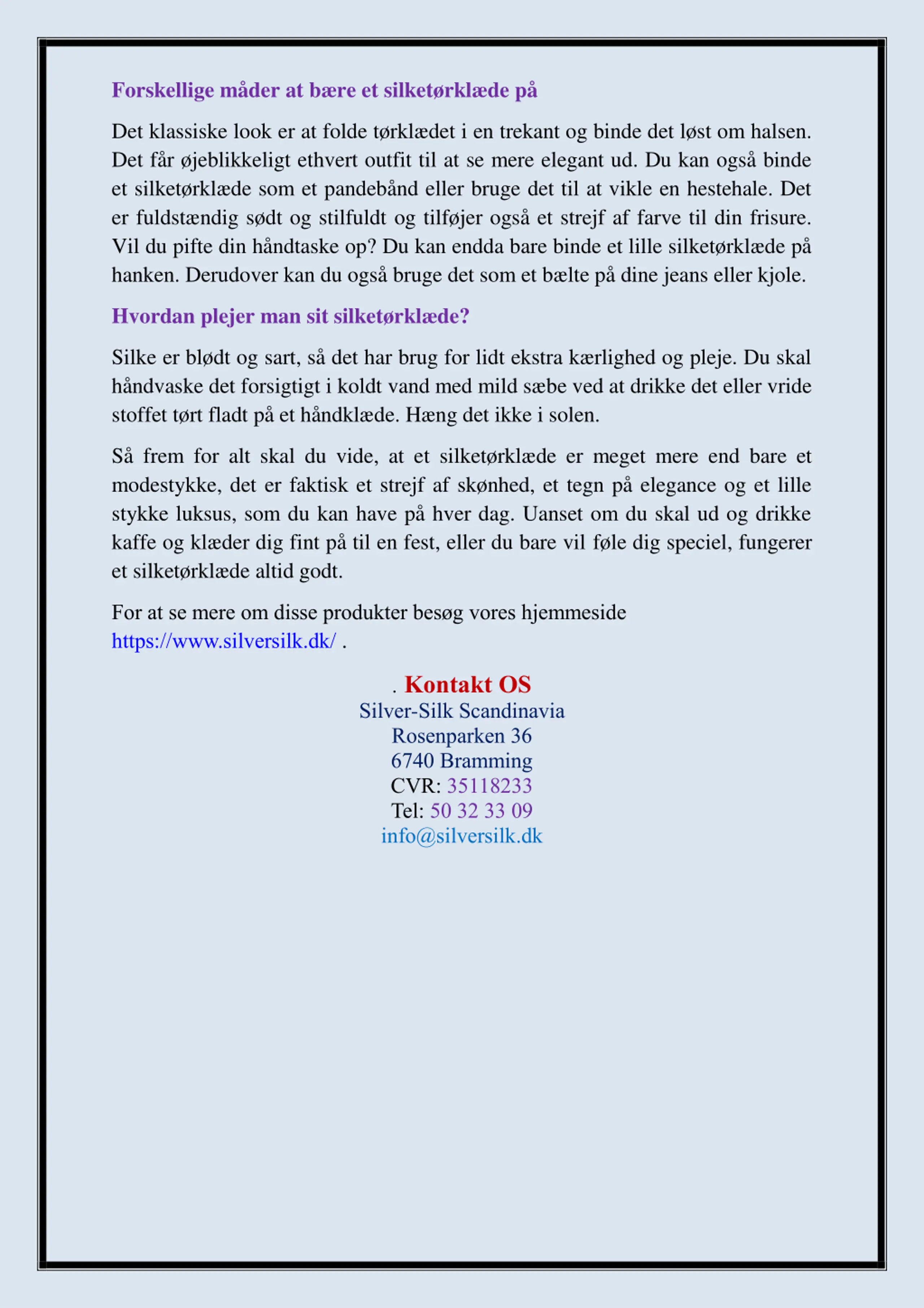 Forskellige mder at bre et silketrklde p Det klassiske look er at folde t rkl det i en trekant og binde det l st om halsen. Det f r jeblikkeligt ethvert outfit til at se mere elegant ud. Du kan ogs binde et silket rkl de som et pandeb nd eller bruge det til at vikle en hestehale. Det er fuldst ndig s dt og stilfuldt og tilf jer ogs et strejf af farve til din frisure. Vil du pifte din h ndtaske op? Du kan endda bare binde et lille silket rkl de p hanken. Derudover kan du ogs bruge det som et b lte p dine jeans eller kjole. Hvordan plejer man sit silket rkl de? Silke er bl dt og sart, s det har brug for lidt ekstra k rlighed og pleje. Du skal h ndvaske det forsigtigt i koldt vand med mild s be ved at drikke det eller vride stoffet t rt fladt p et h ndkl de. H ng det ikke i solen. S frem for alt skal du vide, at et silket rkl de er meget mere end bare et modestykke, det er faktisk et strejf af sk nhed, et tegn p elegance og et lille stykke luksus, som du kan have p hver dag. Uanset om du skal ud og drikke kaffe og kl der dig fint p til en fest, eller du bare vil f le dig speciel, fungerer et silket rkl de altid godt. For at se mere om disse produkter bes g vores hjemmeside https://www.silversilk.dk/ . .Kontakt OS Silver-Silk Scandinavia Rosenparken 36 6740 Bramming CVR: 35118233 Tel: 50 32 33 09 info@silversilk.dk