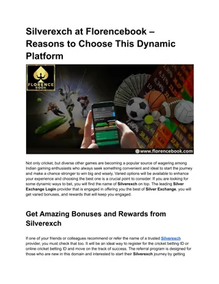 communication. Now, the next crucial step is to fund the Silver Exchange account at Silverexch. You can deposit a minimum amount to activate your Silverexch account. The more you deposit to activate your Silverexch account, the higher welcome bonus you will win. Varied other rewards, cash back, and promotional offers are also offered to you that will be a plus point to enhance your experience. You should never share the account details on any other platform. Silverexch ID Login Easy and Hassle-Free Silverexch is the leading platform where you register for the online cricket Silverexch ID will provide you with diverse safe and secure transaction options. Choose the best one according to your specific needs and move on the track of a successful Silverexch journey. Now, you have to go back to the home page to login with the online cricket Silverexch ID. Once you provide the login ID and submit the password, you will be redirected to the account page. Here, you can manage everything related to the account and check diverse options to bet. Next crucial step to begin the Silverexch journey is exploring Silverexch markets and checking the Silverexch lines. It is a crucial step to keep you engaged and ensures you are on the right track of success. Explore Silverexch Markets and Check the Silverexch Lines Checking the Silverexch lines is an important decision to make so that you can bet wisely. It will provide you with diverse options and help you make an informed decision. When it comes to searching for the top platforms where you can register for the online cricket Silver Exchange, you will find the name of Silverexch on top. The leading online cricket Silverexch ID provider has carved a special niche for offering diverse options in Silverexch and ensuring you are getting a chance of winning big and securely. You have to follow the steps and register for the online Silver Exchange Login in easy steps and make a chance to win big. So, what are you looking for? Stay in touch with experts at Florence Book and make a chance to win big.