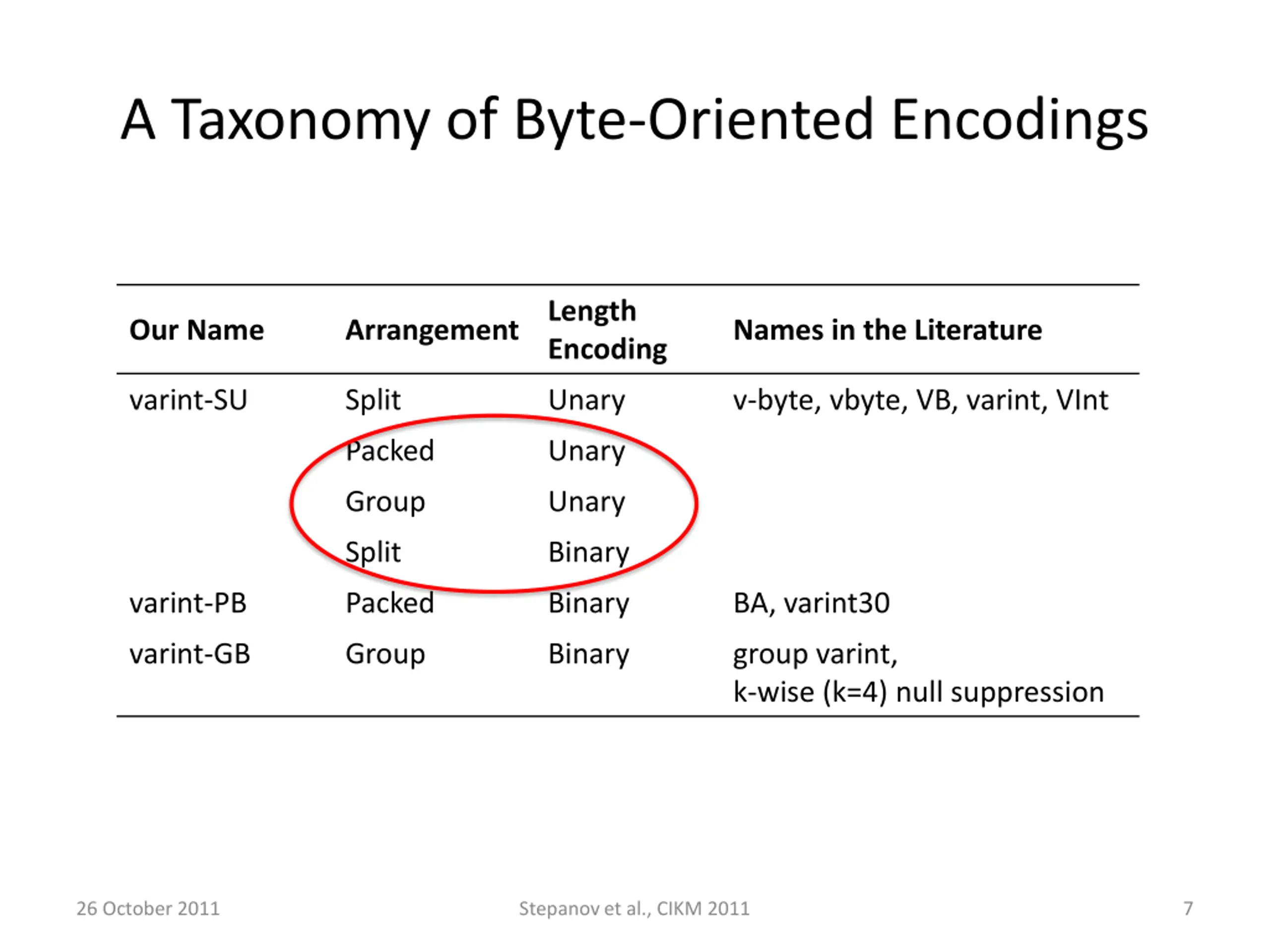 A Taxonomy of Byte-Oriented Encodings Length Encoding Our Name Arrangement Names in the Literature varint-SU Split Unary v-byte, vbyte, VB, varint, VInt Packed Unary Group Unary Split Binary varint-PB Packed Binary BA, varint30 varint-GB Group Binary group varint, k-wise (k=4) null suppression 26 October 2011 Stepanov et al., CIKM 2011 7
